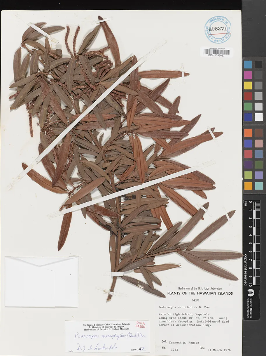 | 3 | Podocarpus macrophyllus | (Thunb.) Sweet | Honolulu | Street tree, common. | PRESERVED_SPECIMEN | Little Jr., E.L. | Collector Number: 40503 | Oahu | BISH | 9/3/1987 |