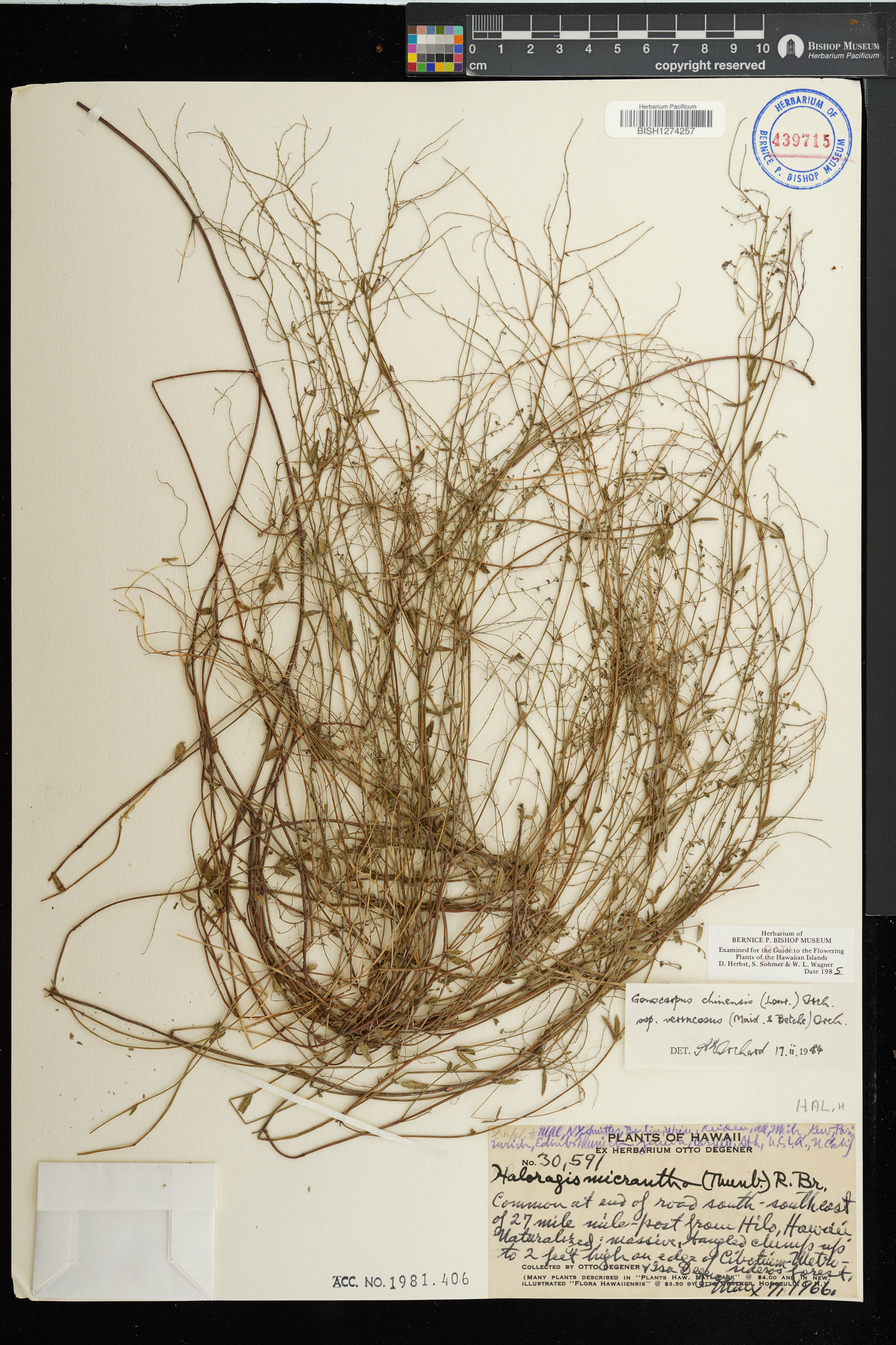 4 Gonocarpus chinensis subsp. verrucosus (Maiden & Betche) Orchard at end of road sse of 27 mile mile post from hilo PRESERVED_SPECIMEN o. degener & i. degener 30591 Hawaii US 5/7/1966