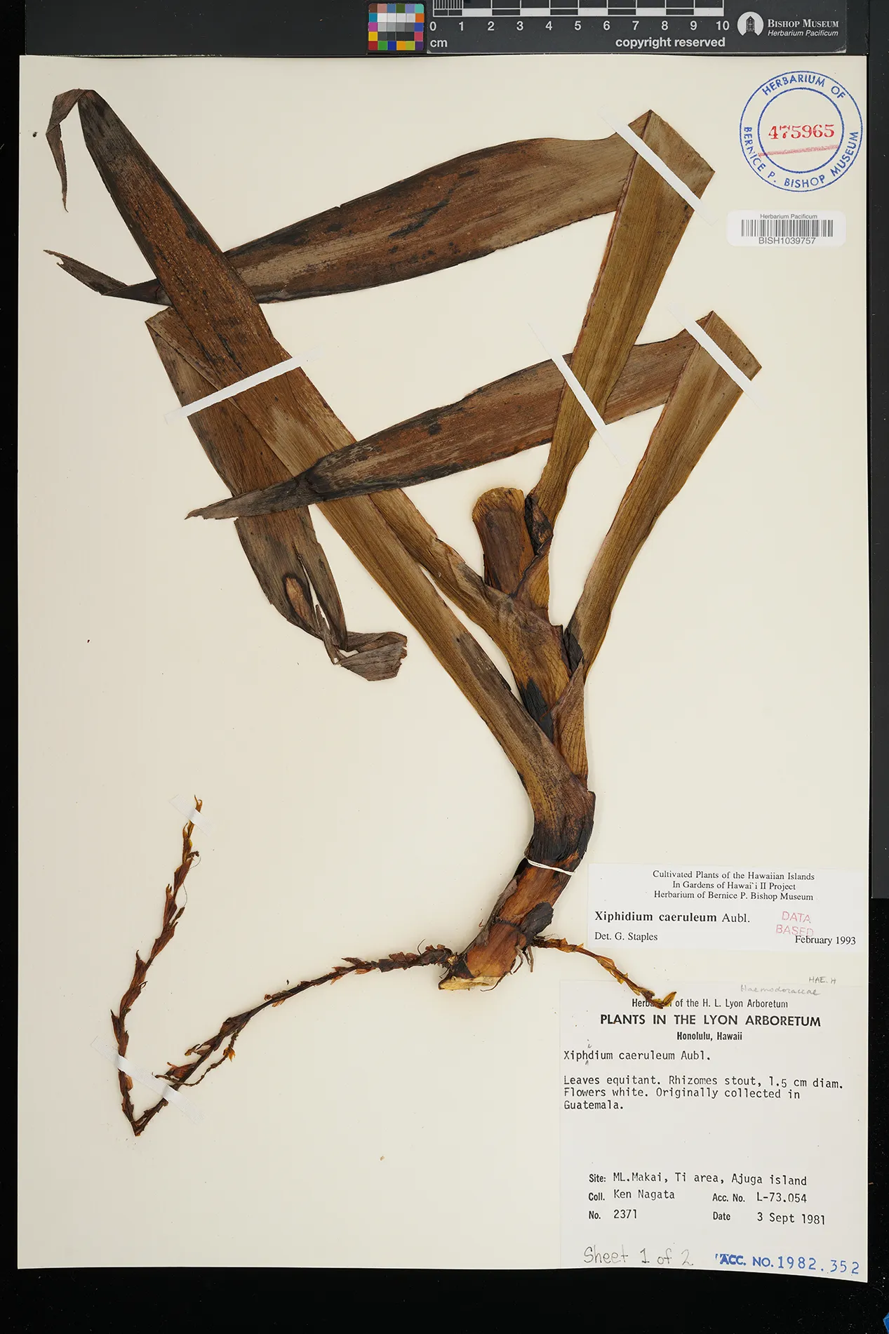 | 7 | Xiphidium caeruleum | Aubl. | Bishop Museum | Potted in greenhouse. | PRESERVED_SPECIMEN | Staples, G. | 7648 | Oahu | BISH | 11/8/1991 |