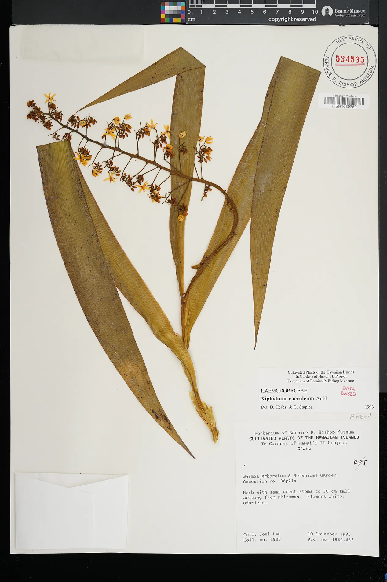 | 2 | Xiphidium caeruleum | Aubl. | waimea arboretum & botanical garden | PRESERVED_SPECIMEN | lau, j. | collector number: 2987 | Oahu | BISH | 12/3/1986 | |