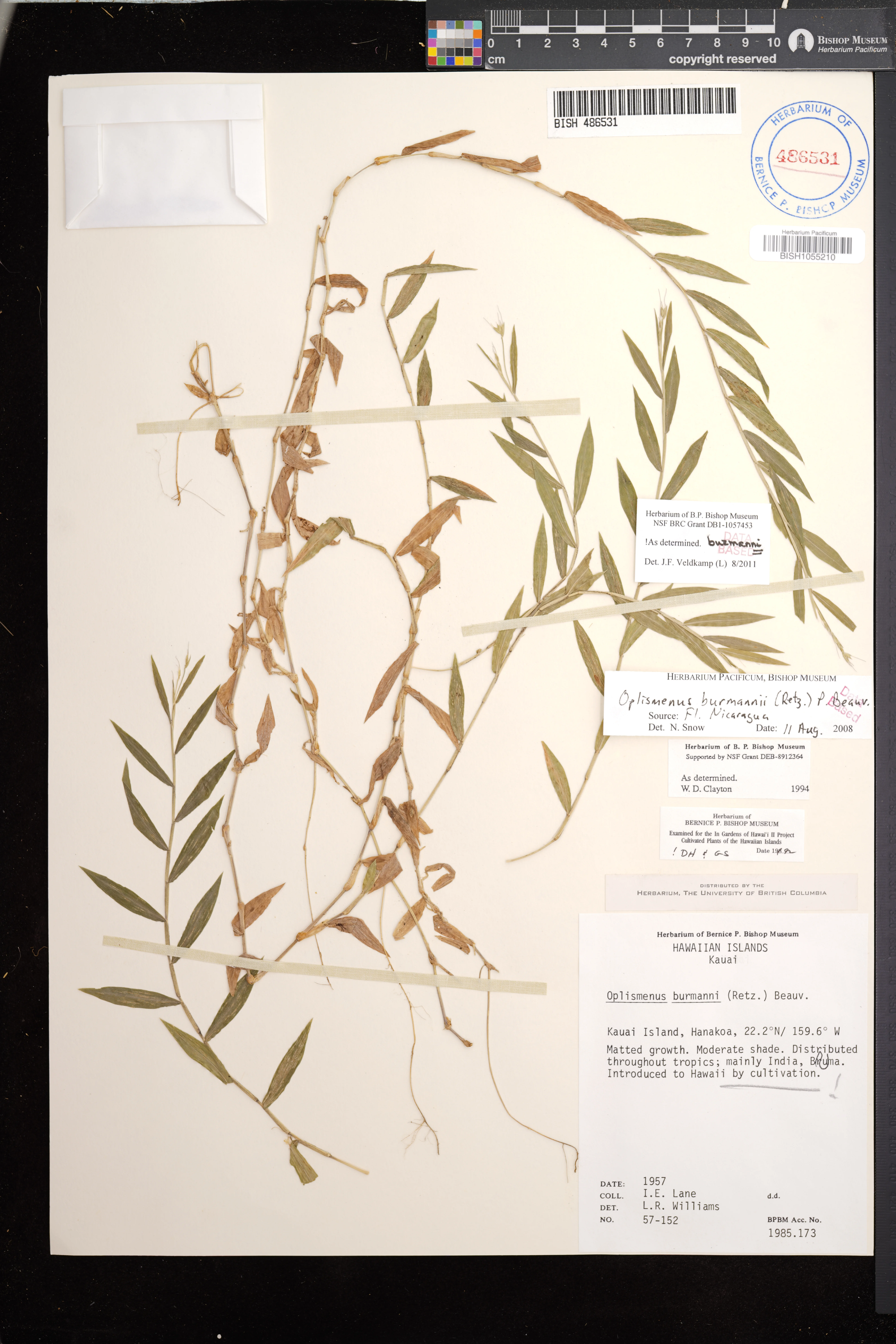 | 4 | Oplismenus burmanni | (Retz.) P.Beauv. | Kauai Island, Hanakoa | moderate shade | PRESERVED_SPECIMEN | I.E. Lane | 57-152 | UBC | 1/1/1957 | |