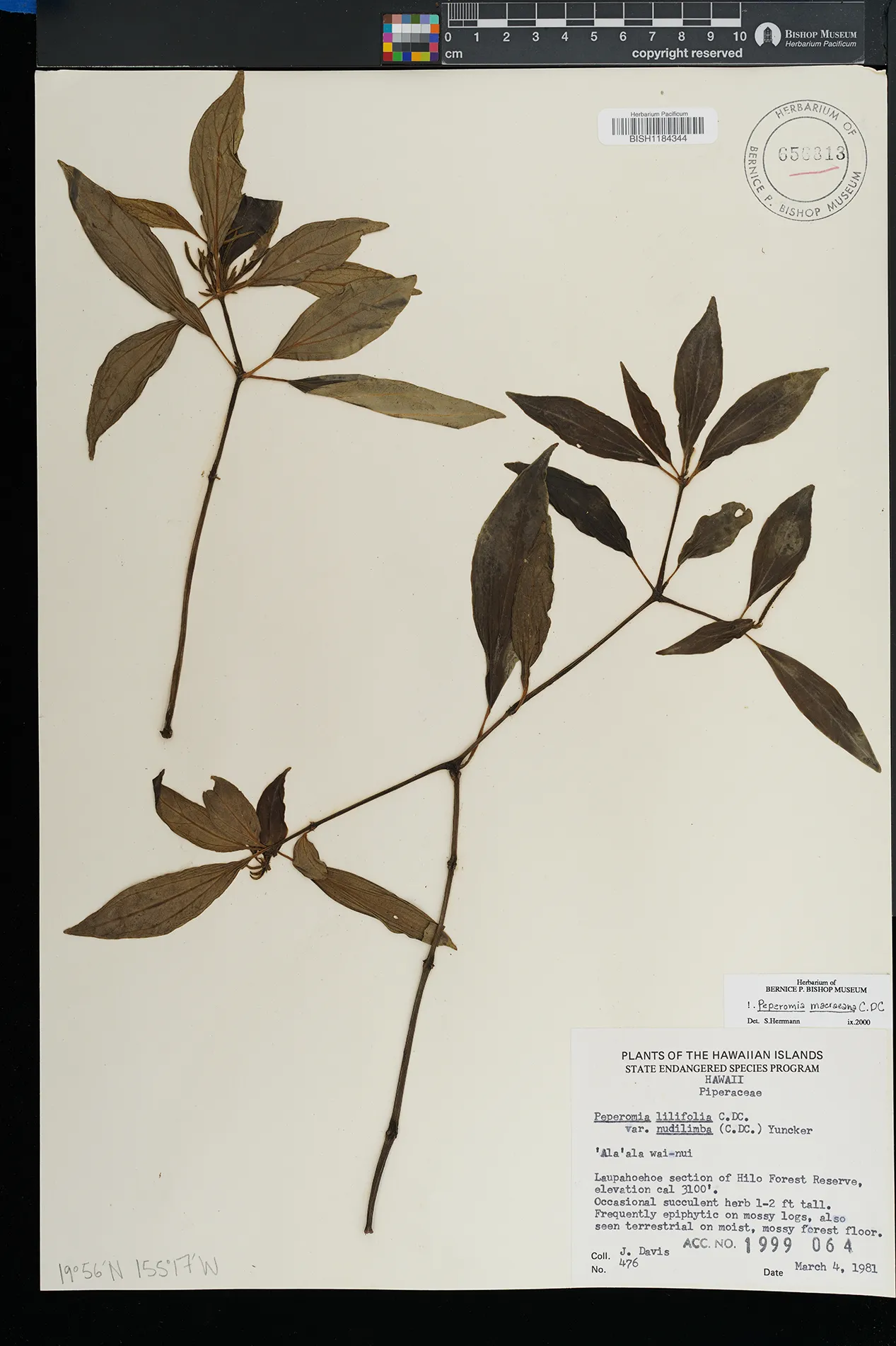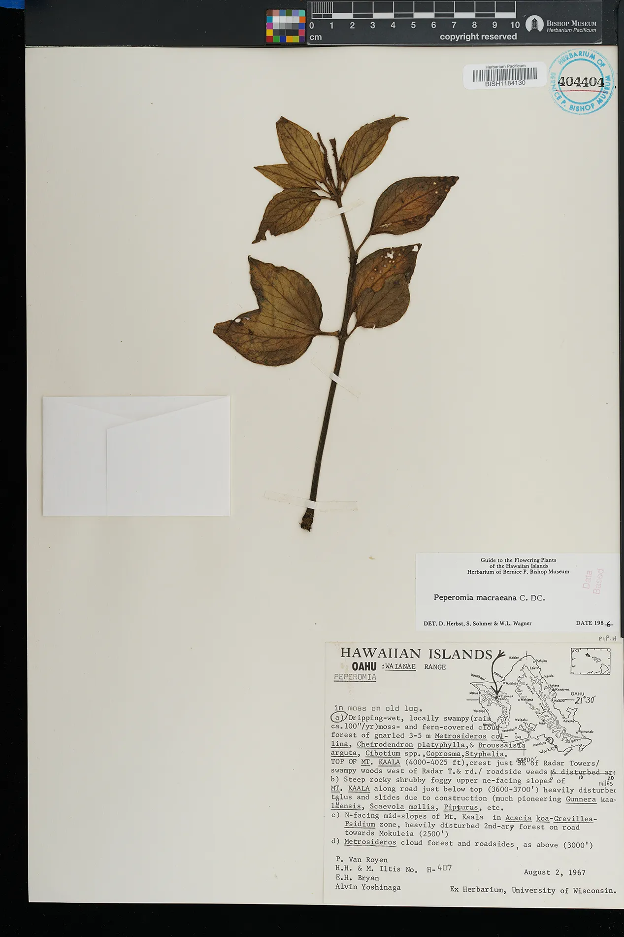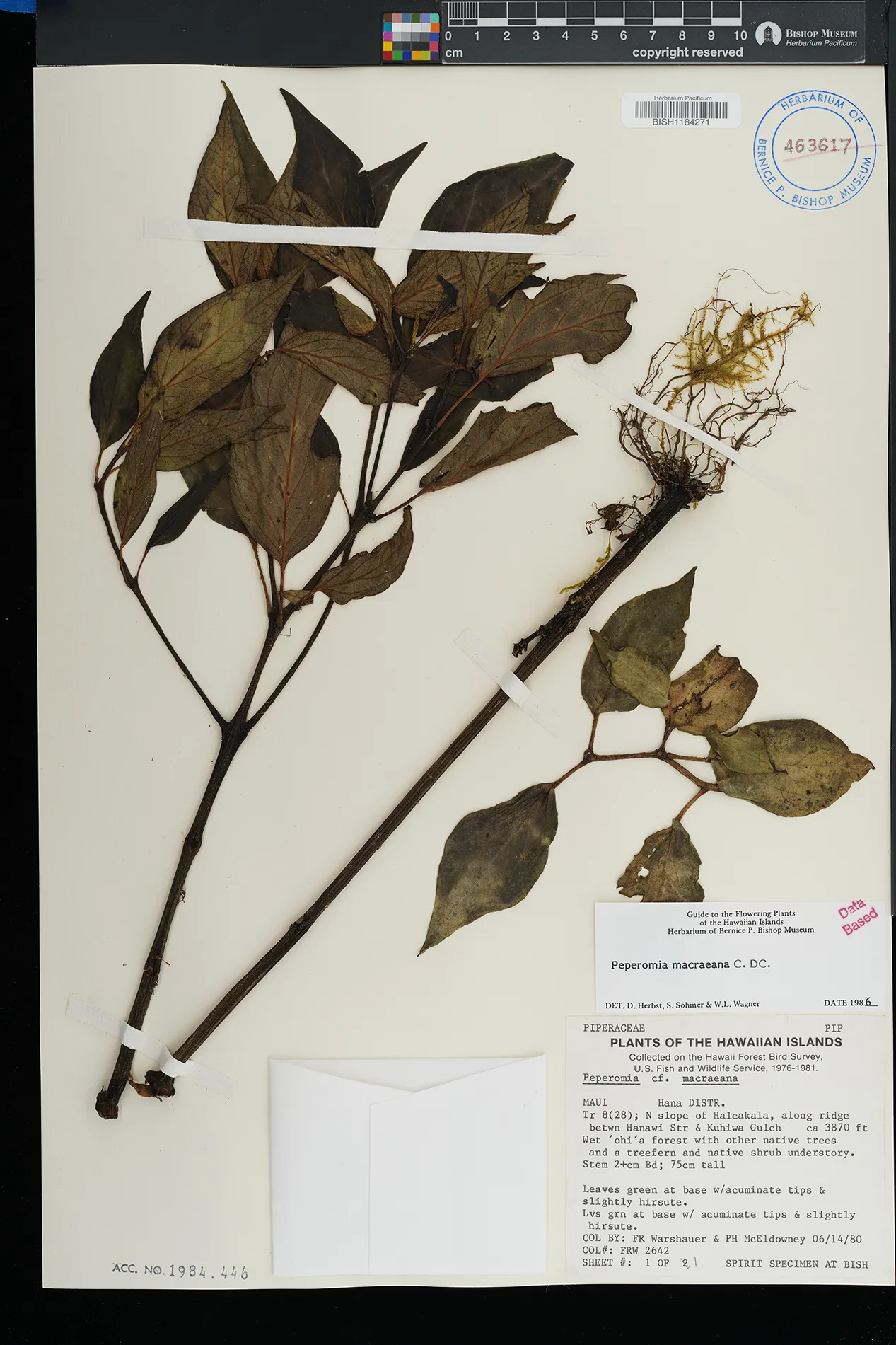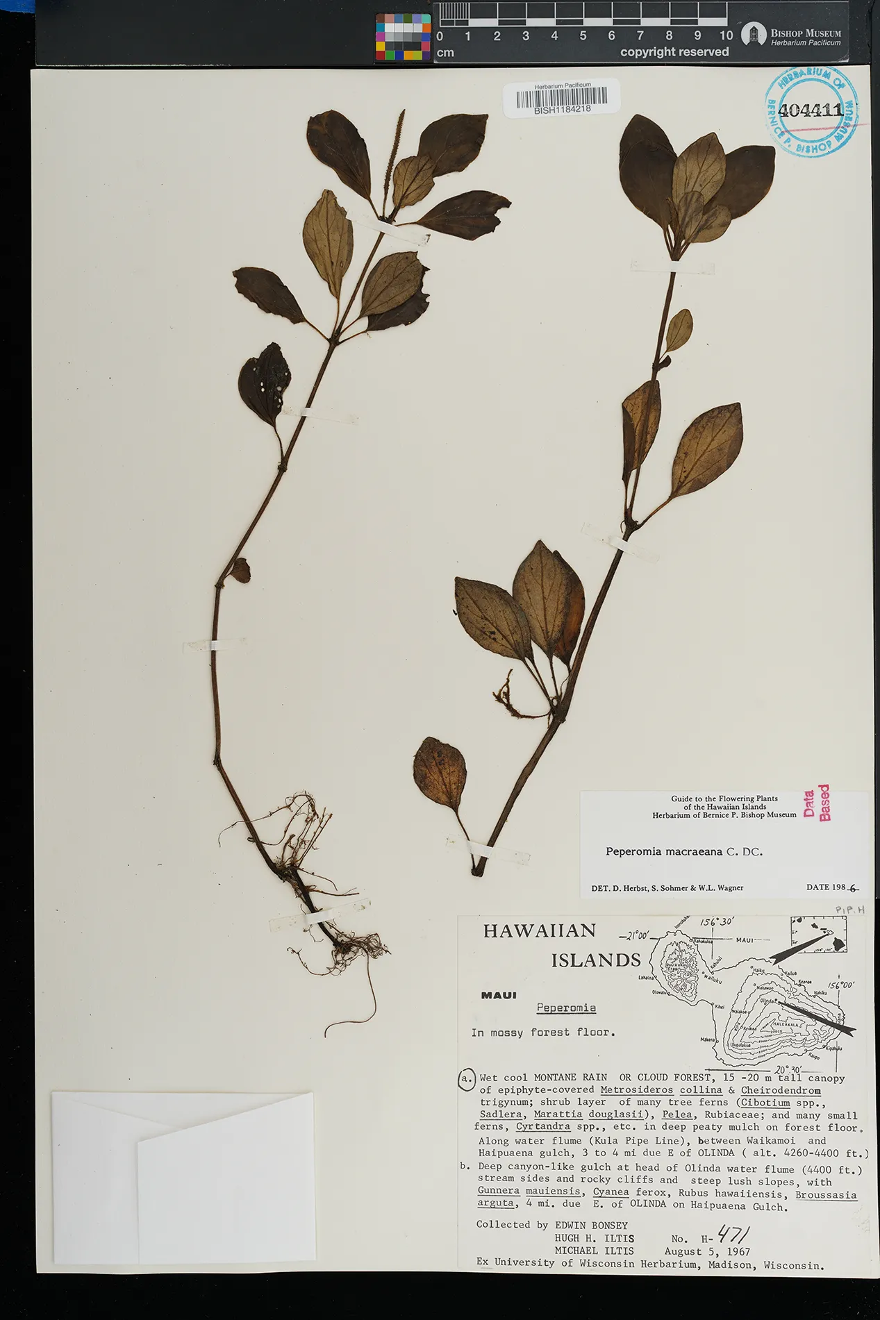 KAUAI: Waimea canyon, upper Kawaiiki valley, north of Kalua- haulu ridge, between ridge and stream, north facing slope. |