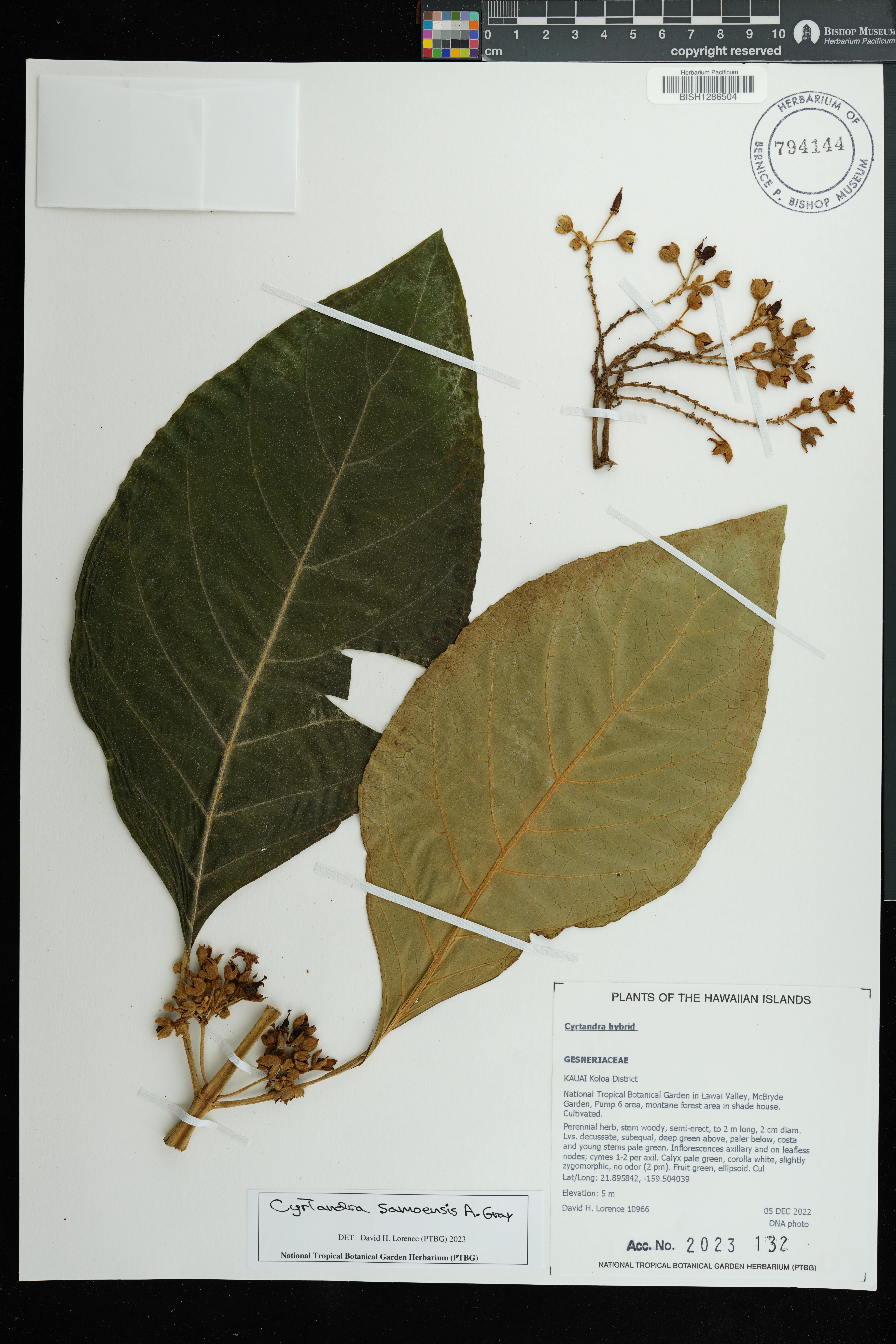 | 2 | Cyrtandra samoensis | Koloa, NTBG Garden in Lawai Valley, McBryde Garden, Horticulture Center and Nursery, | Preserved_Specimen | Shrub w/ multiple erect stems to 1.5 m tall. Leaves glossy medium green above, paler below. Calyx pale greenish white, corolla white. Fruit green ripening pinkish white. | D.H. Lorence | 10995 | Kauai | BISH | 2024-02-05 |