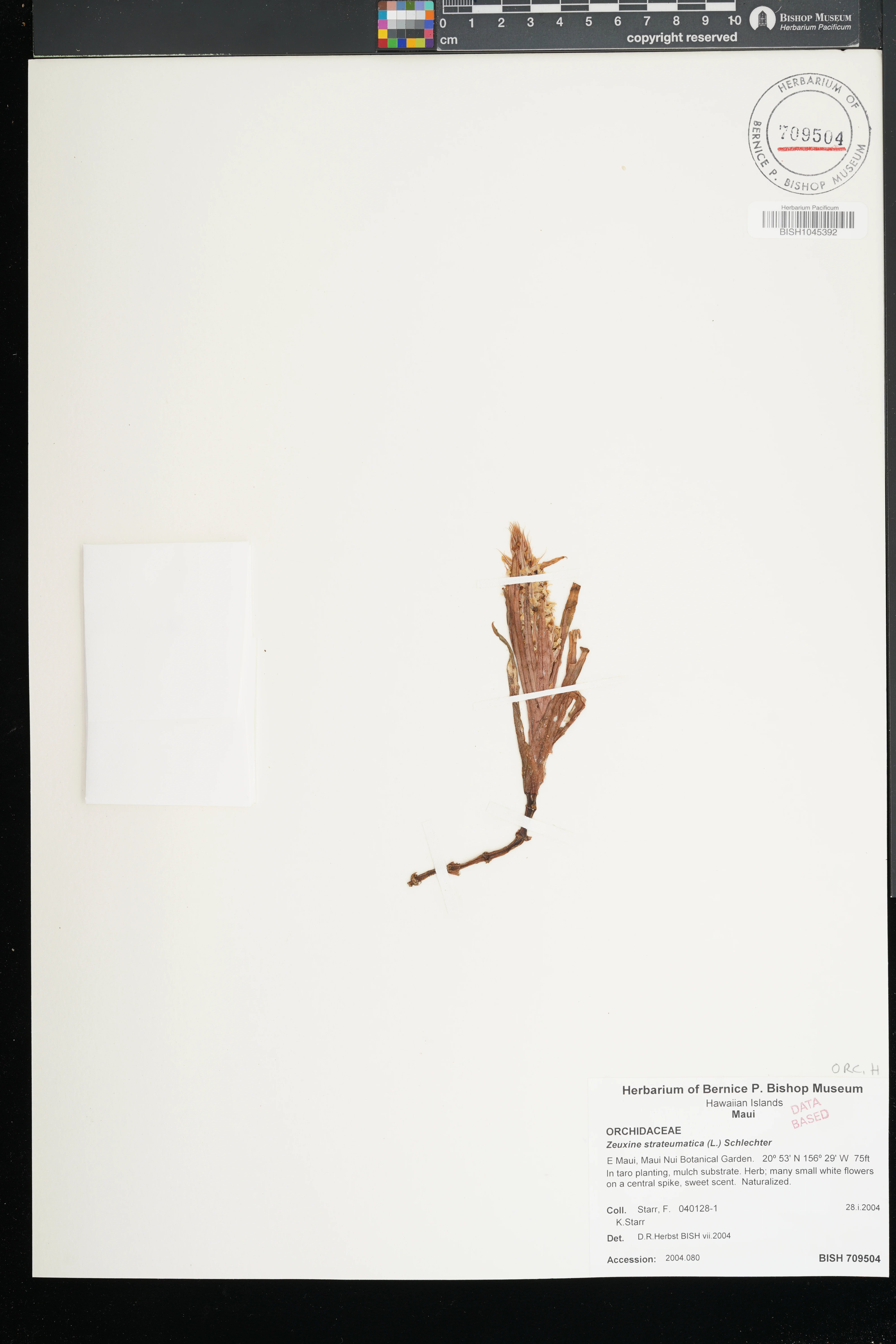 | 5 | Zeuxine strateumatica | (L.) Schltr. | east maui, maui nui botanical garden | In taro planting, mulch substrate. | PRESERVED_SPECIMEN | starr, f. starr, k. | collector number: 040128-1 | Maui | BISH | 1/28/2004 |