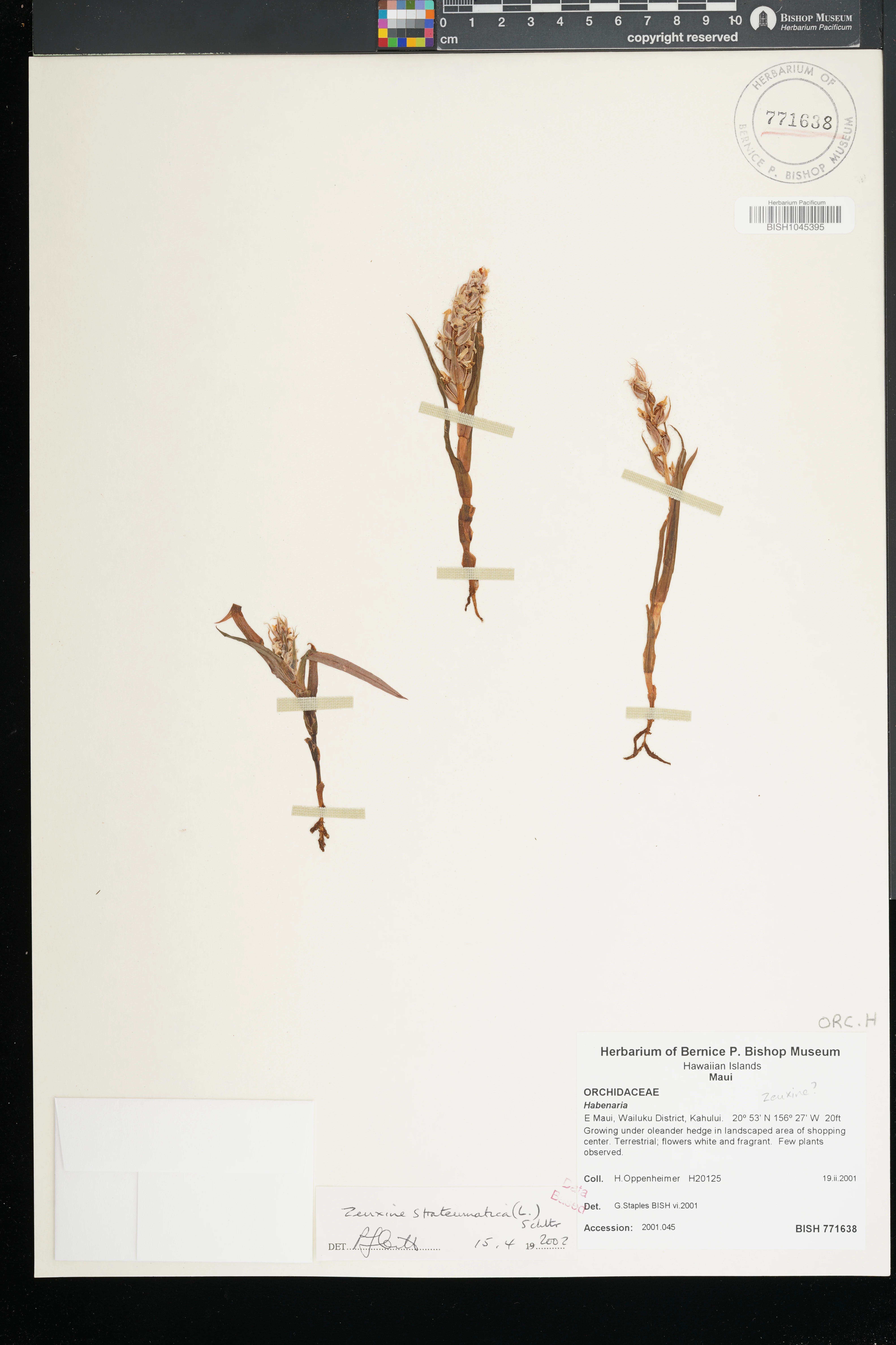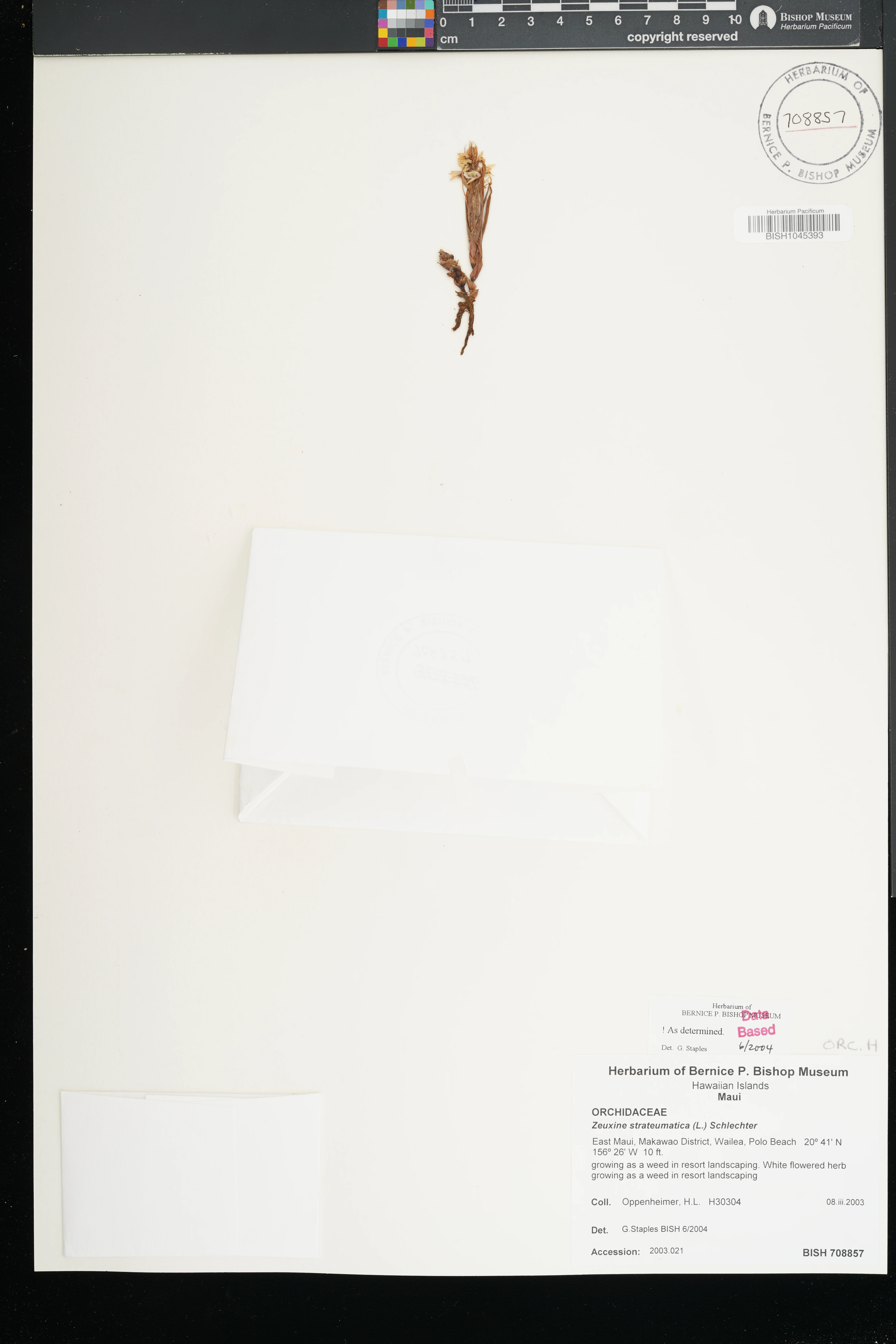 | 13 | Zeuxine strateumatica | (L.) Schltr. | East Maui, Makawao District, Wailea, Polo Beach | growing as a weed in resort landscaping. | PRESERVED_SPECIMEN | Oppenheimer, H.L. | Collector Number: H30304 | Maui | BISH | 3/8/2003 |