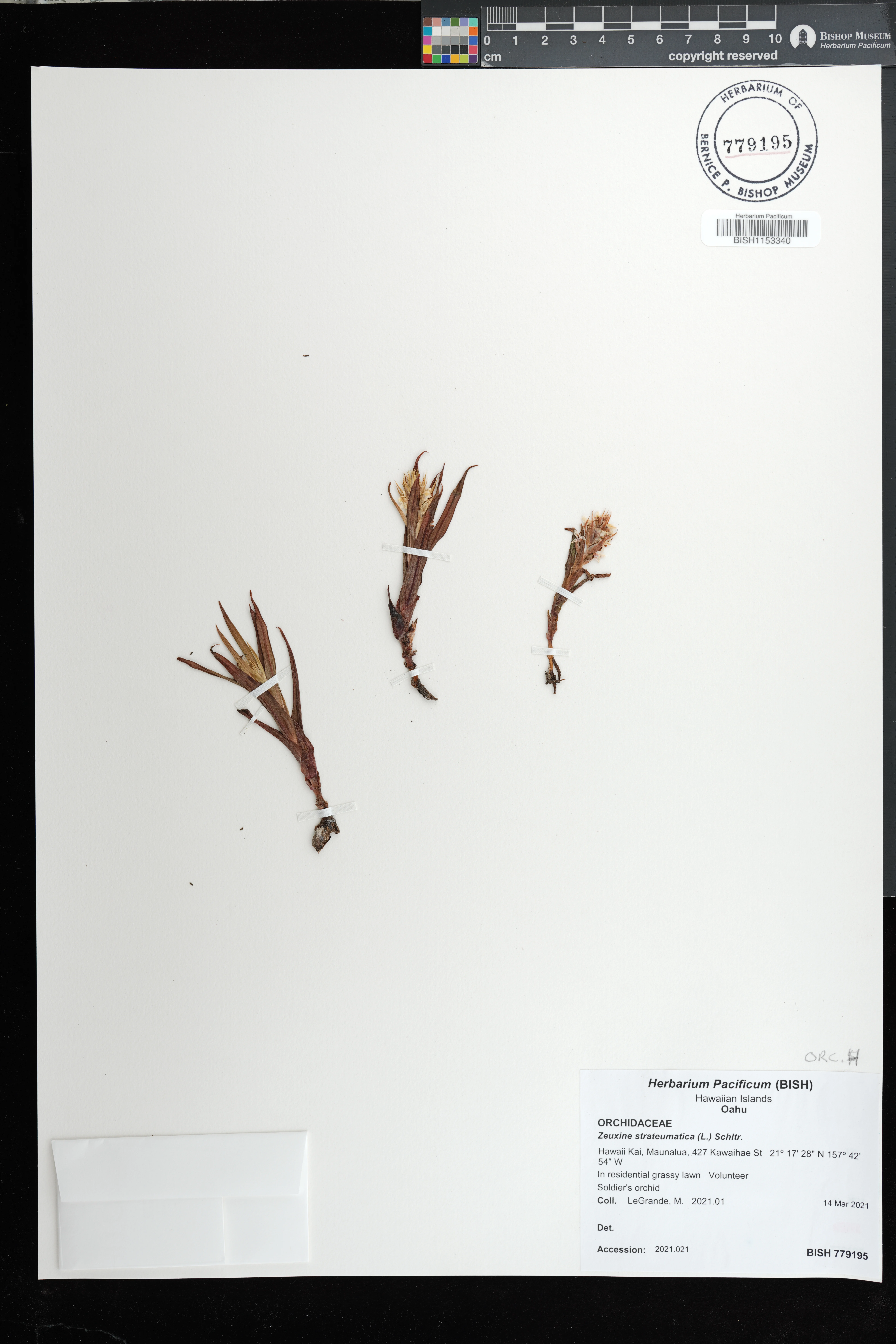 | 3 | Zeuxine strateumatica | (L.) Schltr. | Schofield, West Base ONARP, in front of seed lab building. | Growing out of planter box. Understory of Dodonaea viscosa, Osteomeles anthylidifolial and other native taxa planted into flower bed. | PRESERVED_SPECIMEN | Kawelo, K. | USARMY 526 | Oahu | BISH | 12/17/2019 |