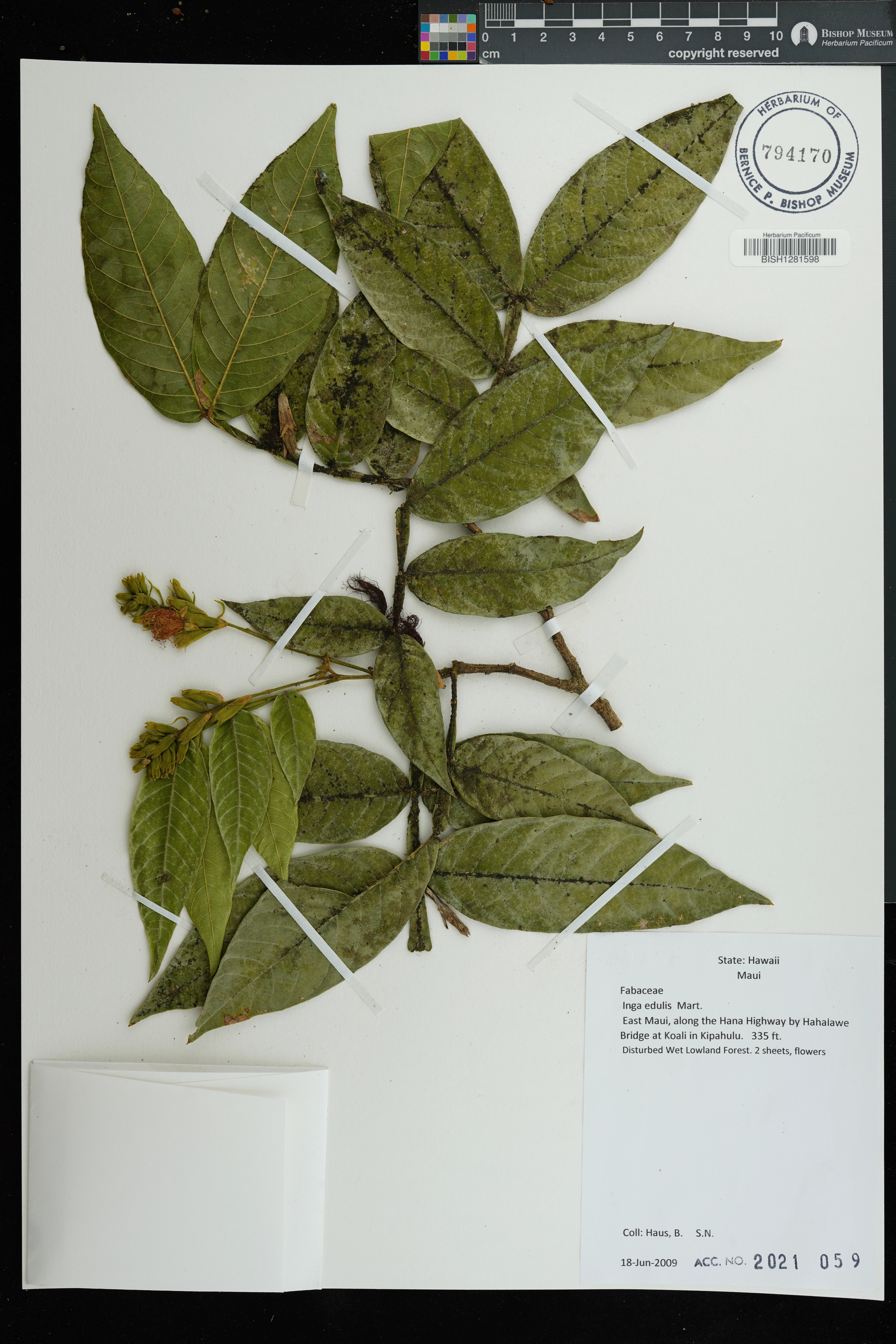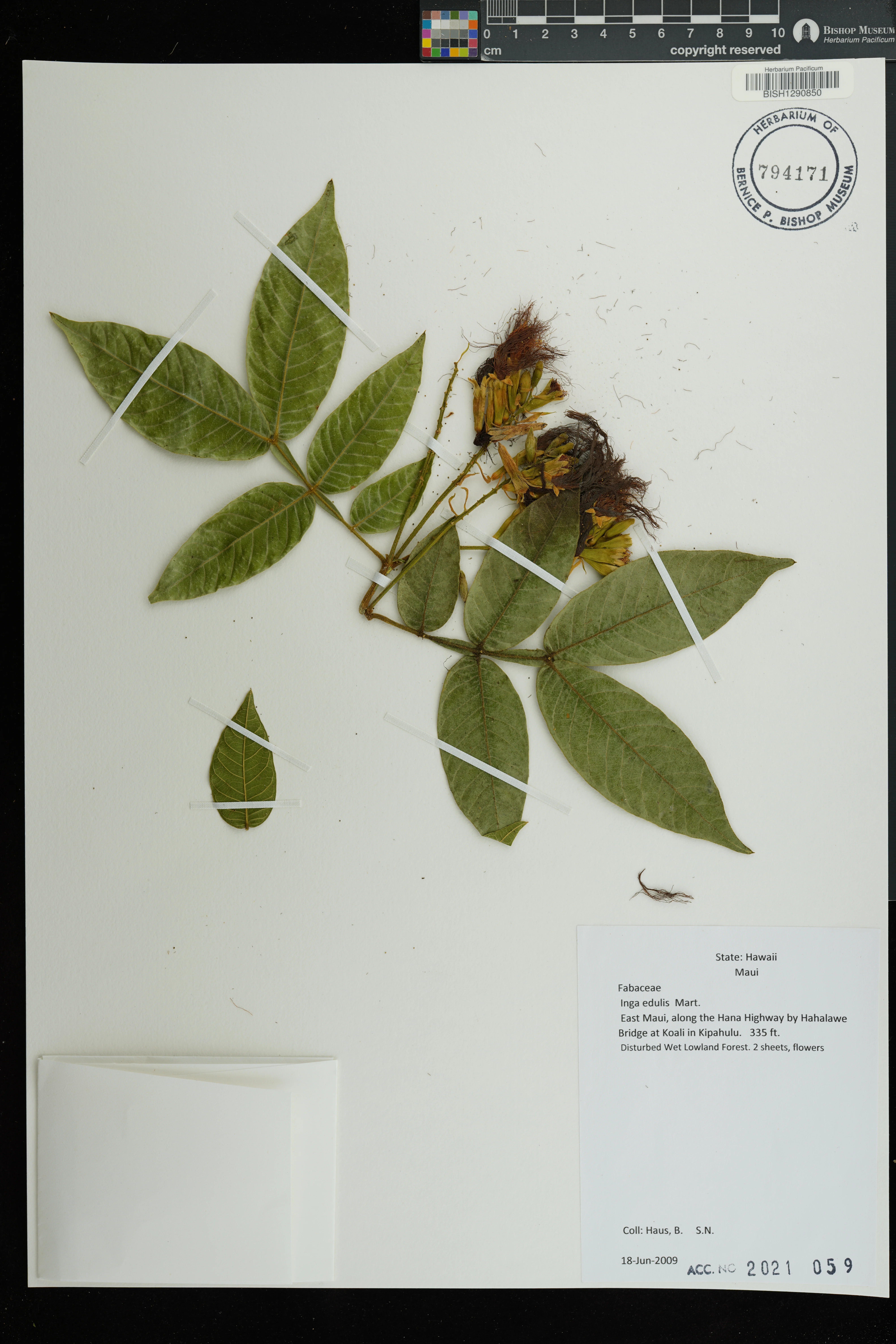 | 4 | Inga edulis | Mart. | Malumalu Farms, Puhi. | Cultivated. | PRESERVED_SPECIMEN | Ronald T. Ota | s.n. | Kauai | PTBG | 10/24/2014 |