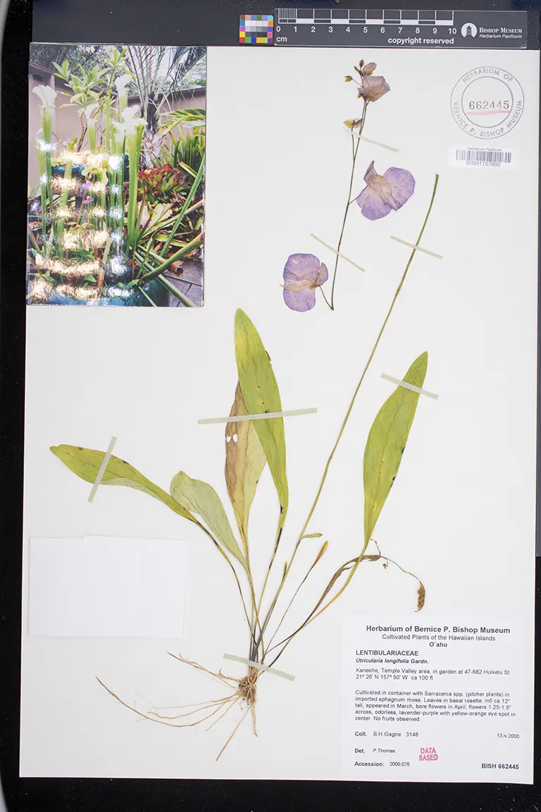 | 3 | Utricularia longifolia | Gardner | Kaneohe, Temple Valley area, in garden at 47-682 Huikelu St | Cultivated in container with Sarracenia spp. (pitcher plants) in imported sphagnum moss. | PRESERVED_SPECIMEN | Gagn??, B.H. | Collector Number: 3148 | Oahu | BISH | 4/13/2000 |
