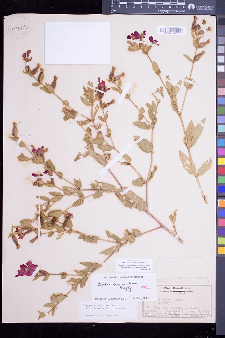 | 3 | Cuphea procumbens | Ortega | 42 coelho way, honolulu | PRESERVED_SPECIMEN | neal, m.c. | Oahu | BISH | 3/11/1941 | ||
