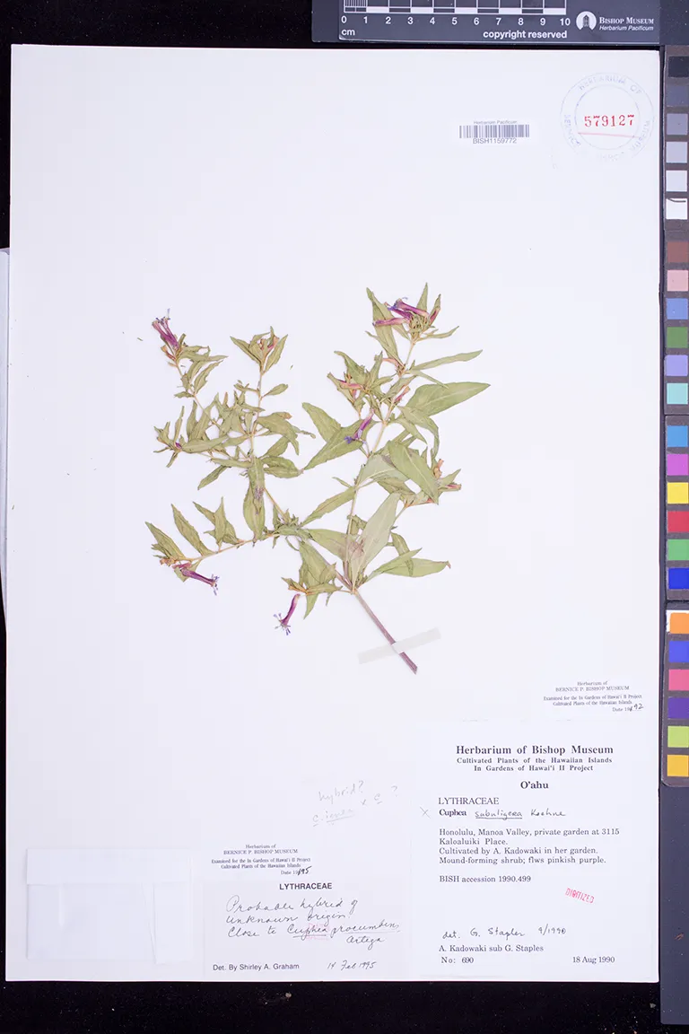 | 6 | Cuphea procumbens | Ortega | Honolulu, 3115 Kaloaluiki Place | garden | PRESERVED_SPECIMEN | Staples, G. | 690 | Oahu | BISH | 8/18/1990 |