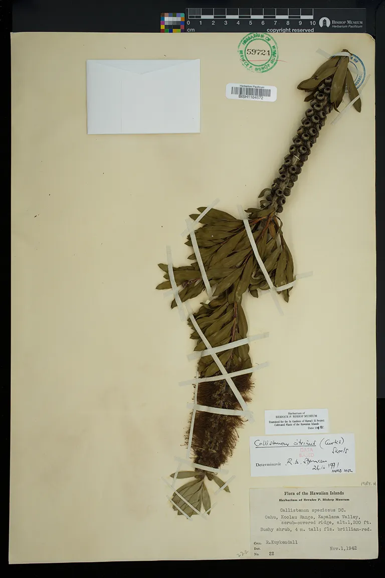 | 10 | Melaleuca citrina | (Curtis) Dum.Cours. | kapalama valley | scrub-covered ridge | PRESERVED_SPECIMEN | kuykendall, j.r. | collector number: 22 | Oahu | BISH | 11/1/1942 |