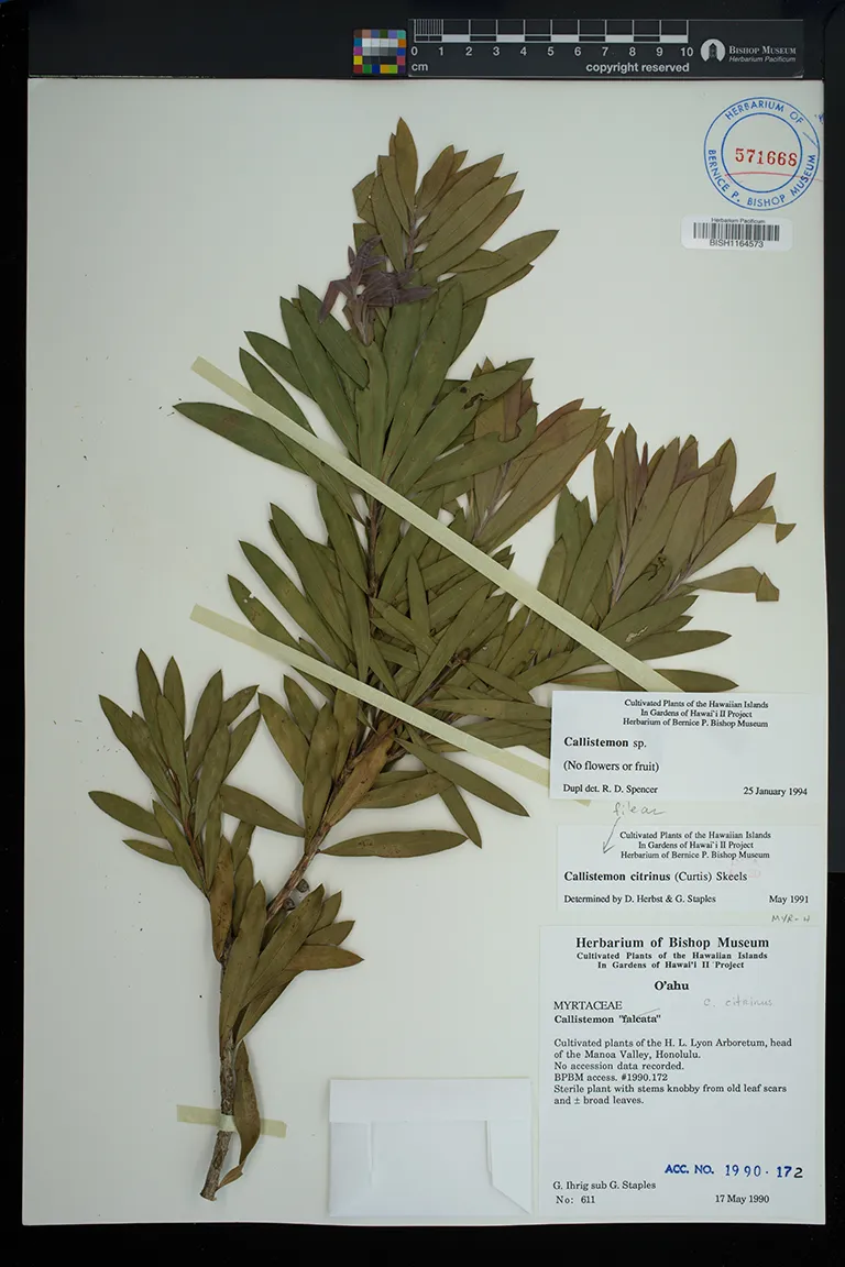 | 2 | Melaleuca citrina | (Curtis) Dum.Cours. | Lyon Arboretum | PRESERVED_SPECIMEN | Staples, G. | 611 | Oahu | BISH | 5/17/1990 | |