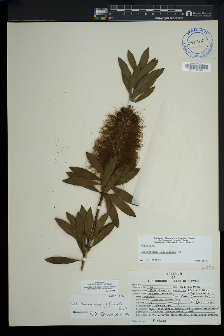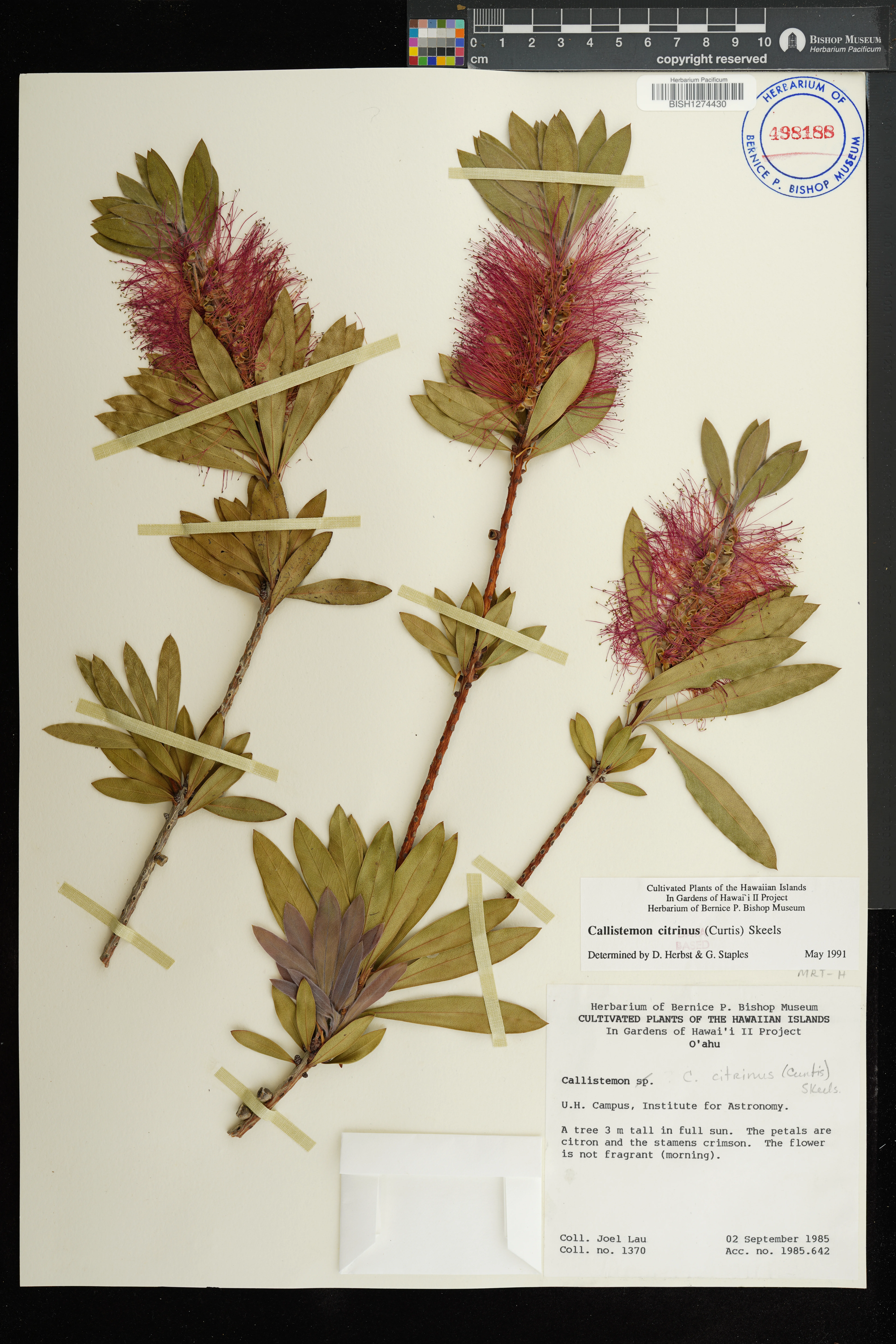 | 11 | Melaleuca citrina | (Curtis) Dum.Cours. | Honolulu, Manoa, Univ. of Hawaii. | PRESERVED_SPECIMEN | W. M. Bush | 694 | Oahu | PTBG | 6/26/1977 |
