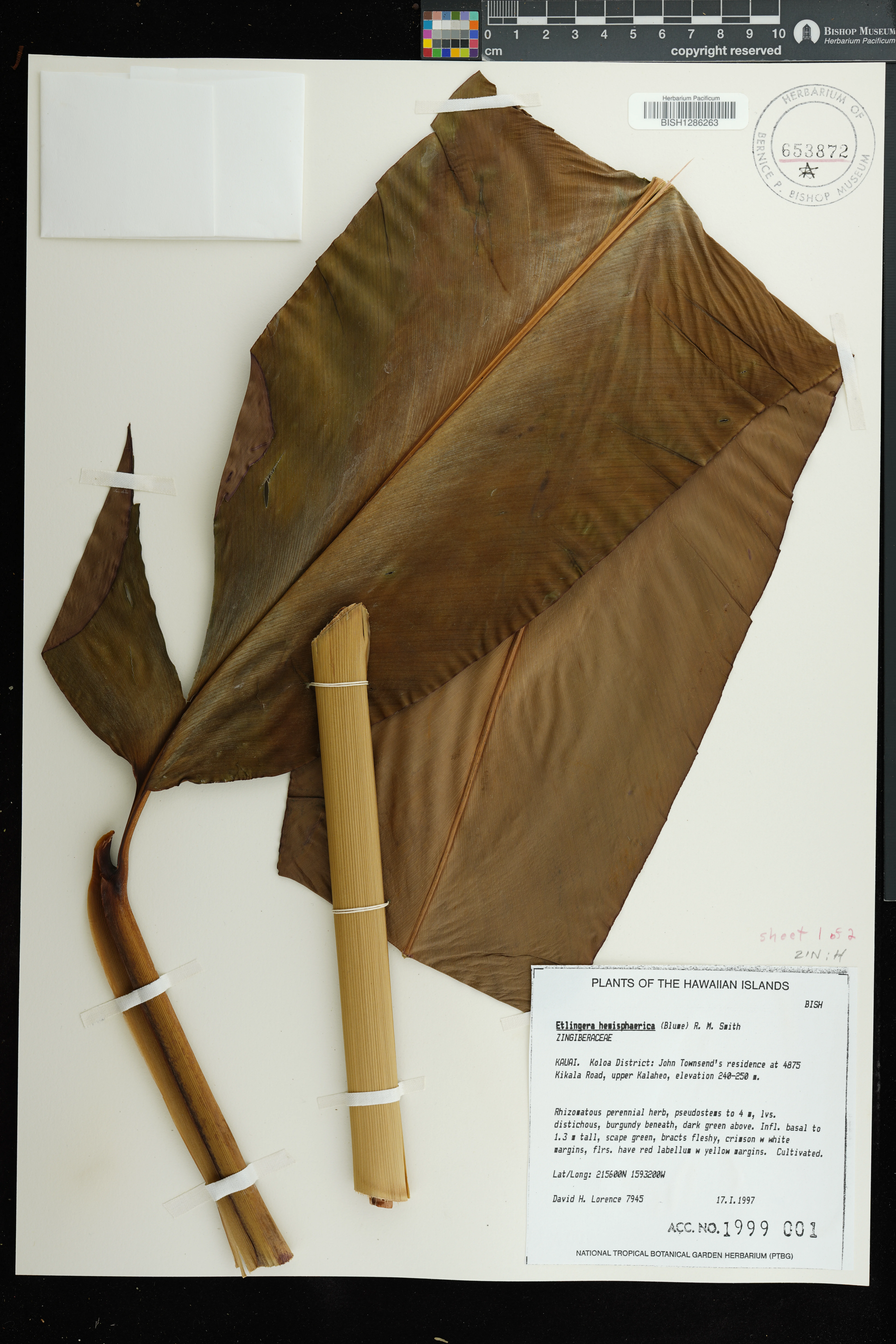 | 4 | Etlingera hemisphaerica | (Blume) R.M.Sm. | Koloa District: John Townsend's residence at 4875 Kikala Road, upper Kalaheo | PRESERVED_SPECIMEN | Lorence, D.H. | Collector Number: 7945 | Kauai | BISH | 1/17/1997 | |