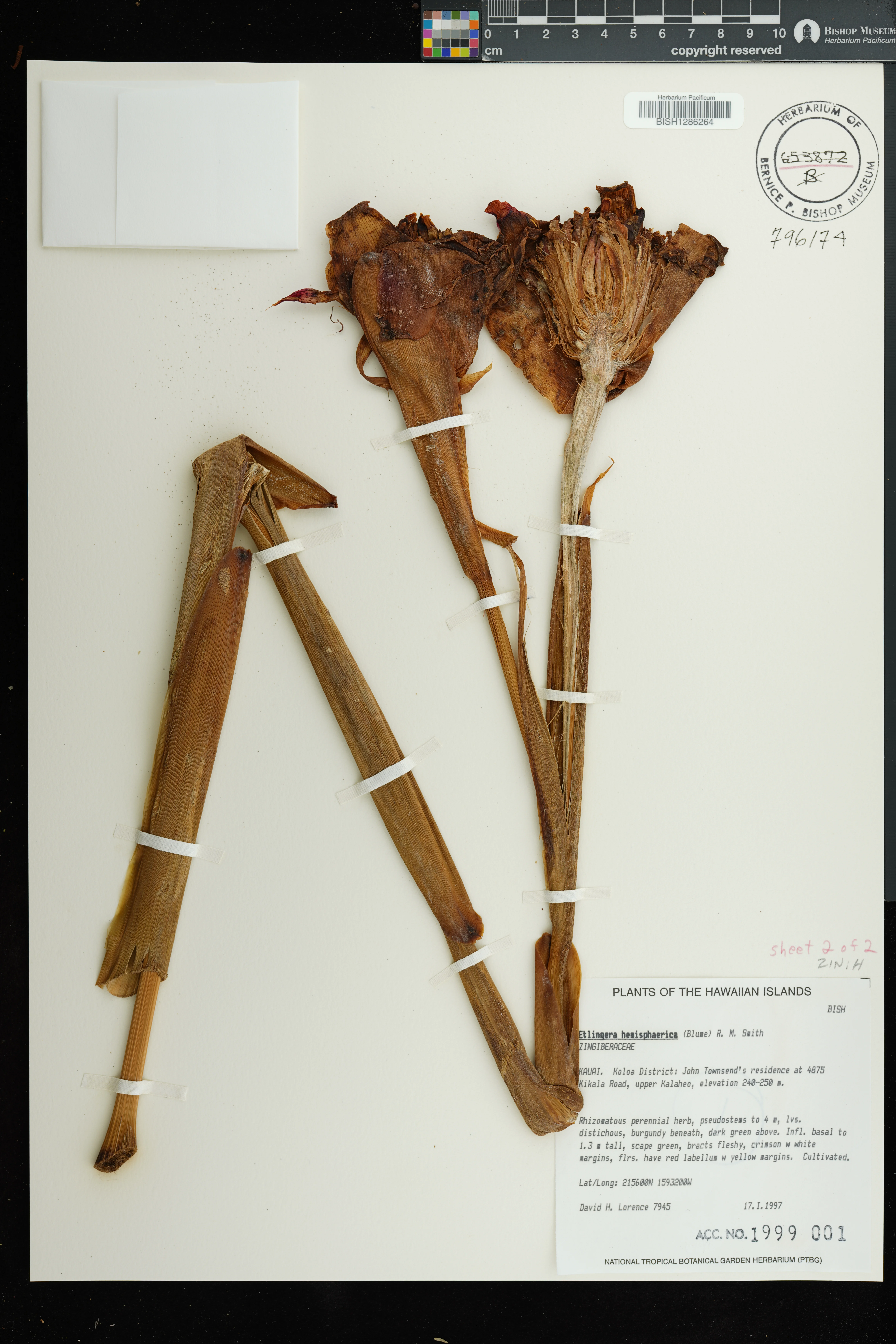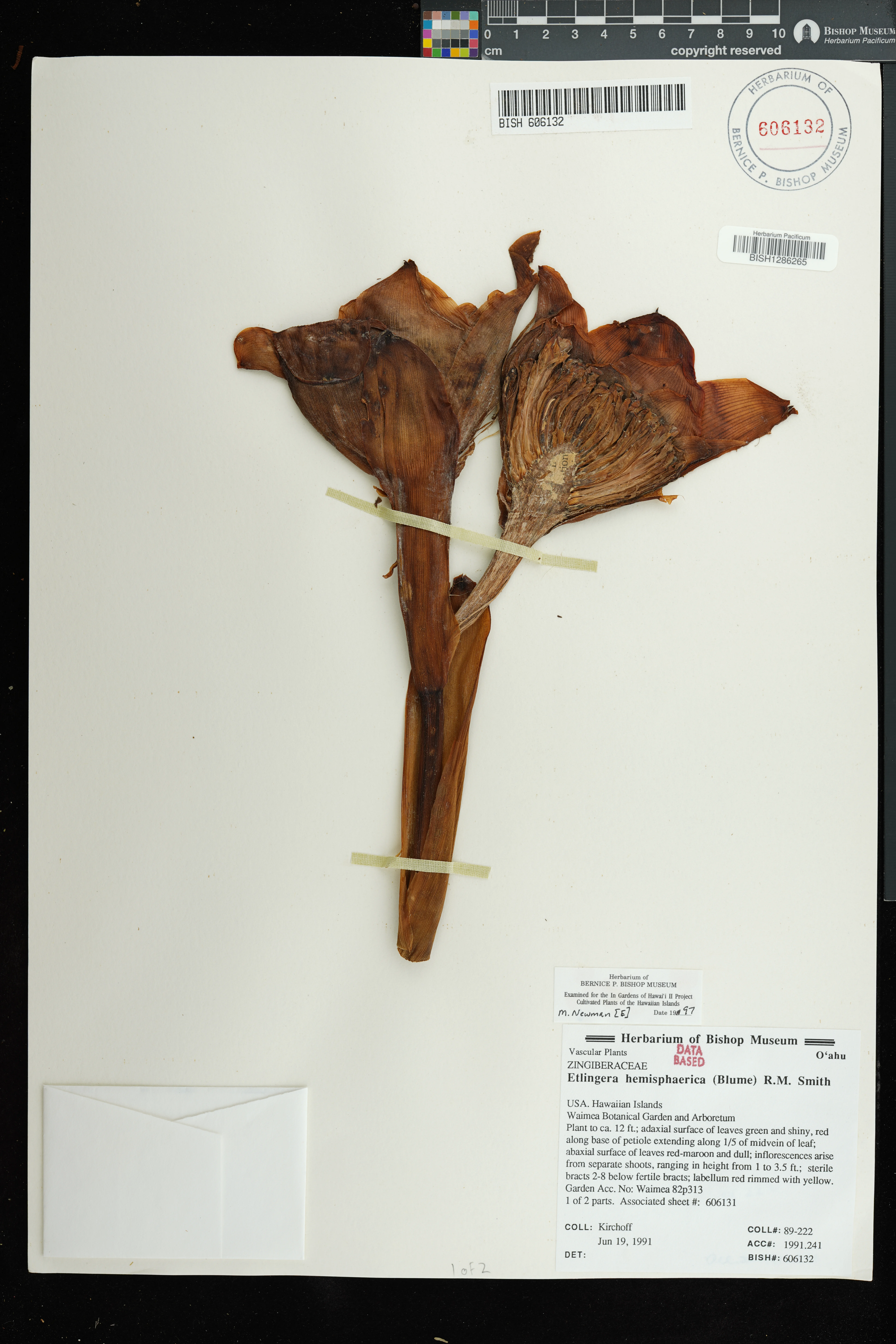 | 1 | Etlingera hemisphaerica | (Blume) R.M.Sm. | Waimea Botanical Garden & Arboretum | PRESERVED_SPECIMEN | Kirchoff, B.K. | 89-222 | Oahu | BISH | 6/19/1991 | |