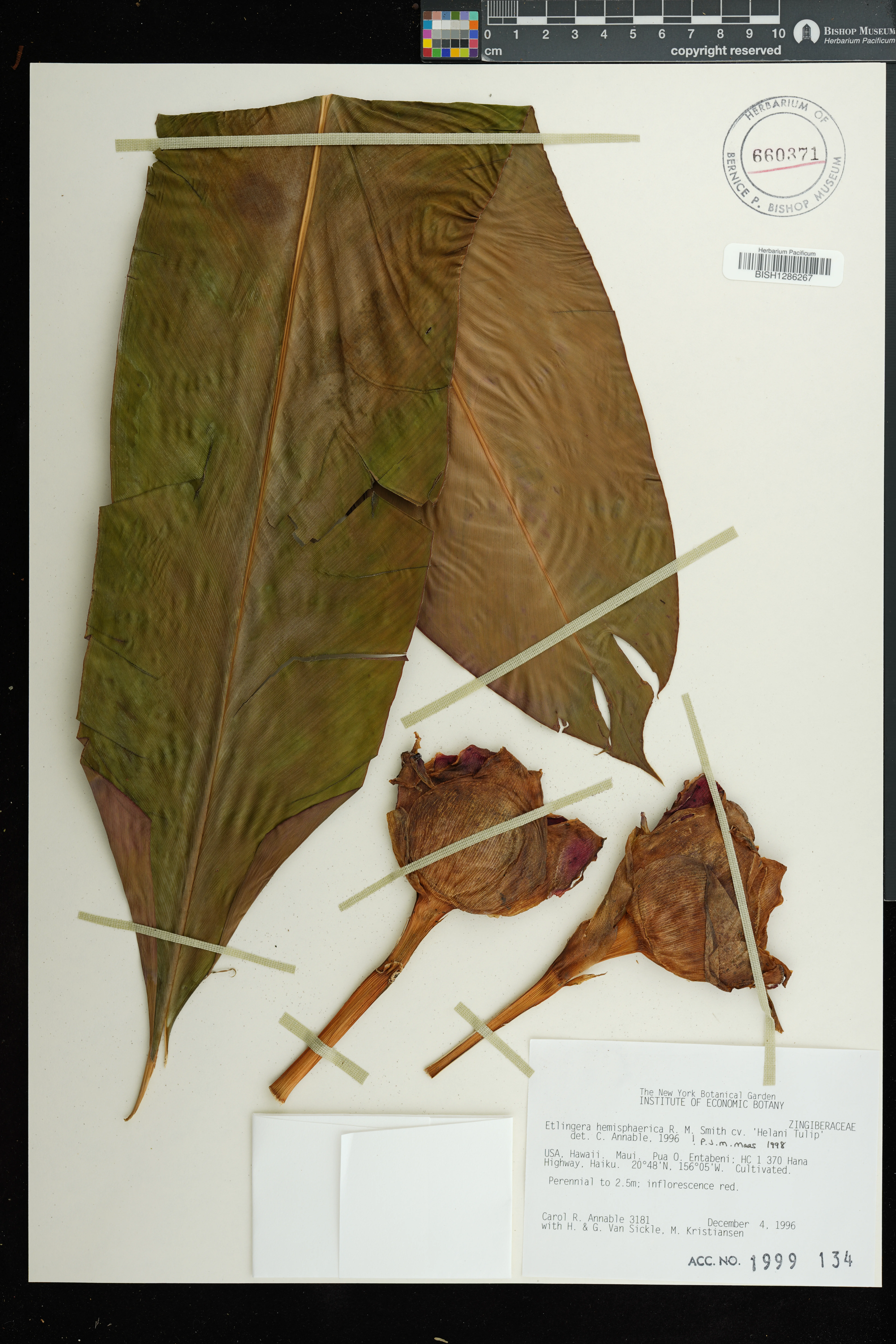 | 7 | Etlingera hemisphaerica | (Blume) R.M.Sm. | Pua O. Entabeni, HC 1 370 Hana Hwy (Private land holding) | Cultivated | PRESERVED_SPECIMEN | C. R. Annable | 3181 | NY | 12/4/1996 | |
