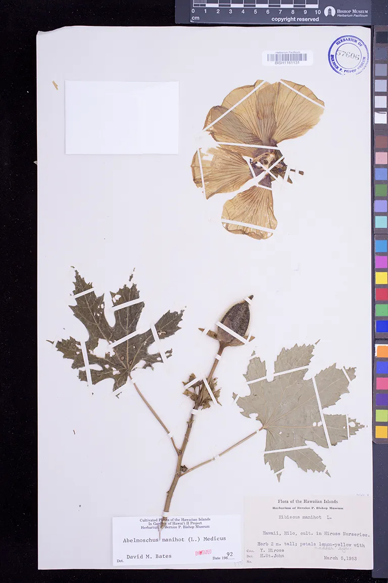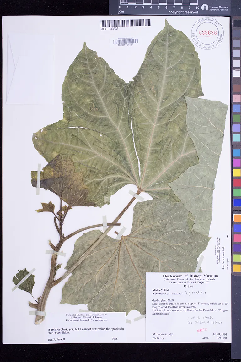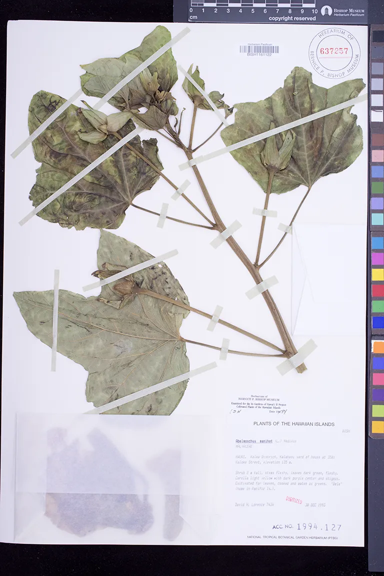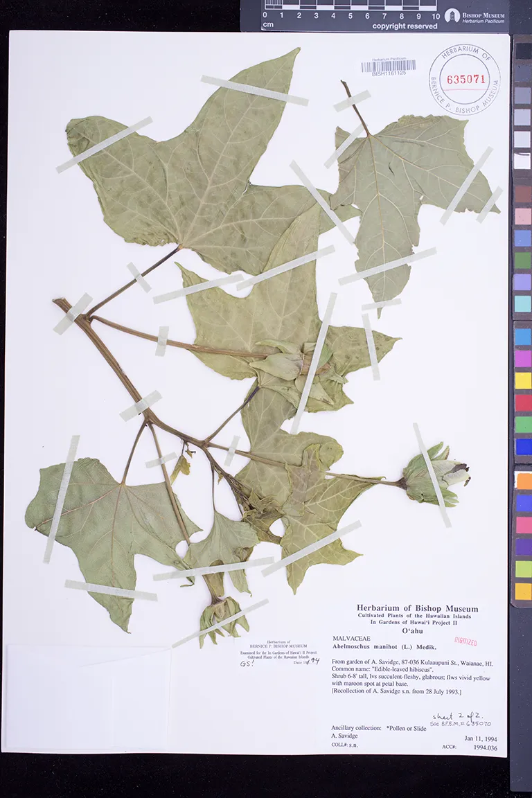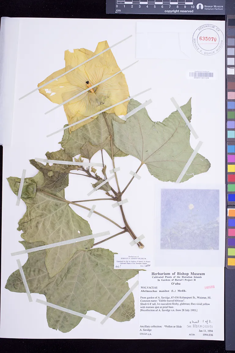 | 11 | Abelmoschus manihot | (L.) Medik. | Maili. Garden plant. | Cultivated plants. | PRESERVED_SPECIMEN | Alexandria Savidge | s.n. | Oahu | PTBG | 7/28/1993 |