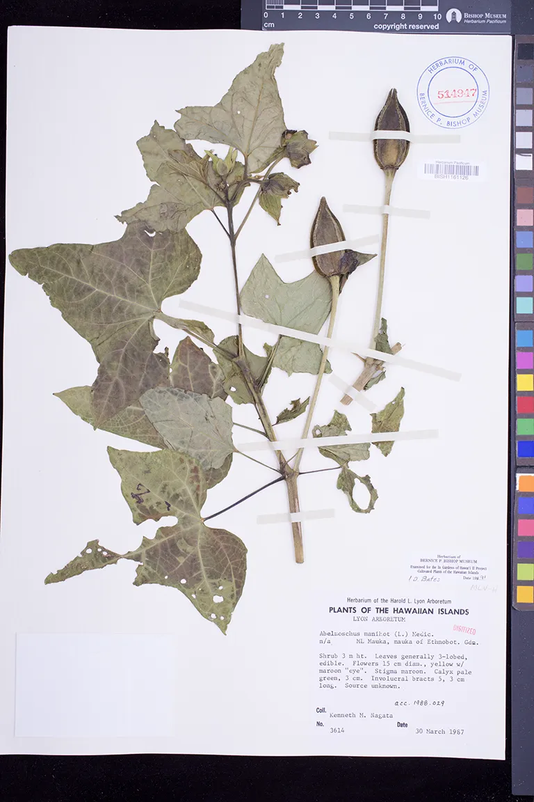 | 19 | Abelmoschus manihot | (L.) Medik. | lyon arboretum, ml mauka, mauka of ethnobot. gdn | PRESERVED_SPECIMEN | nagata, k.m. | collector number: 3614 | Oahu | BISH | 3/30/1987 | |