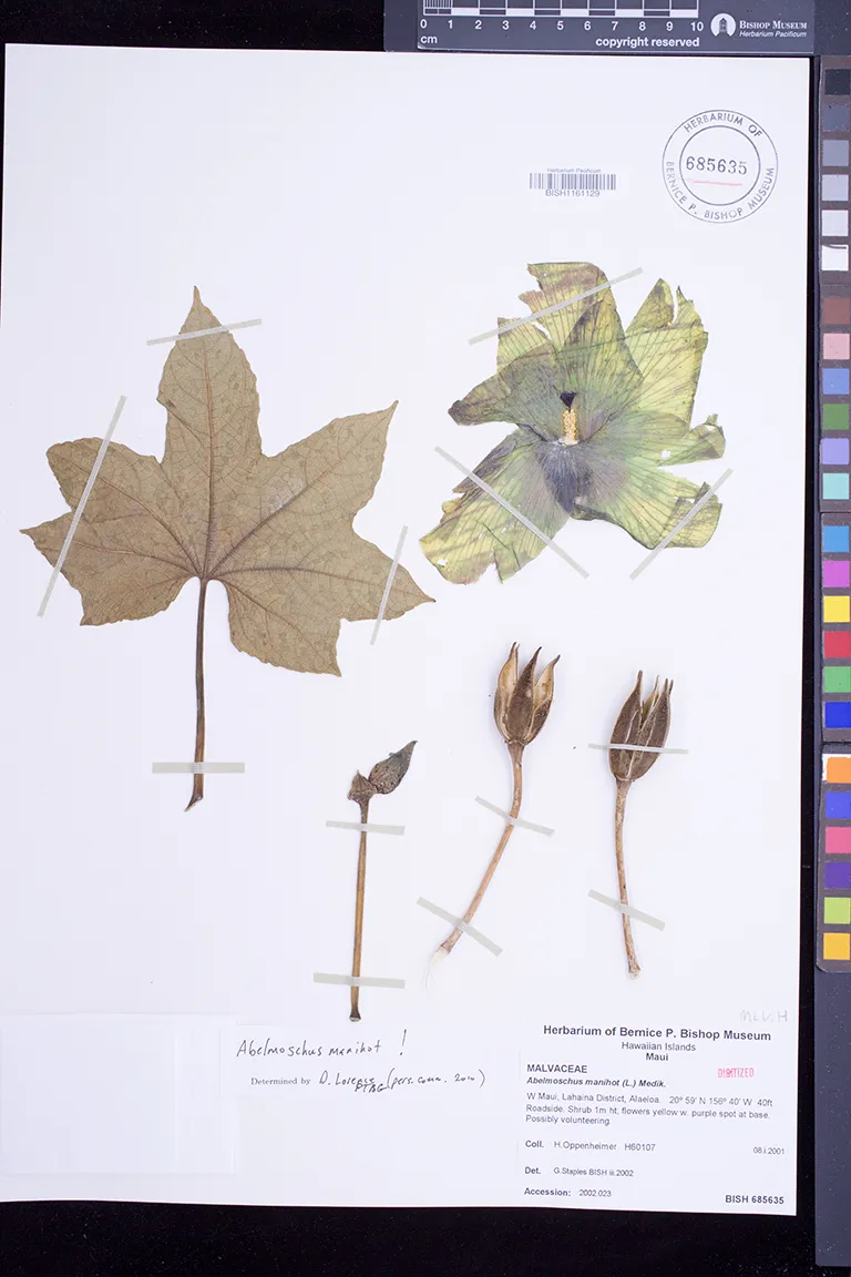 | 13 | Abelmoschus manihot | (L.) Medik. | W. Maui, Alaeloa. | PRESERVED_SPECIMEN | Hank Oppenheimer | H60107 | Maui | PTBG | 6/8/2001 | |