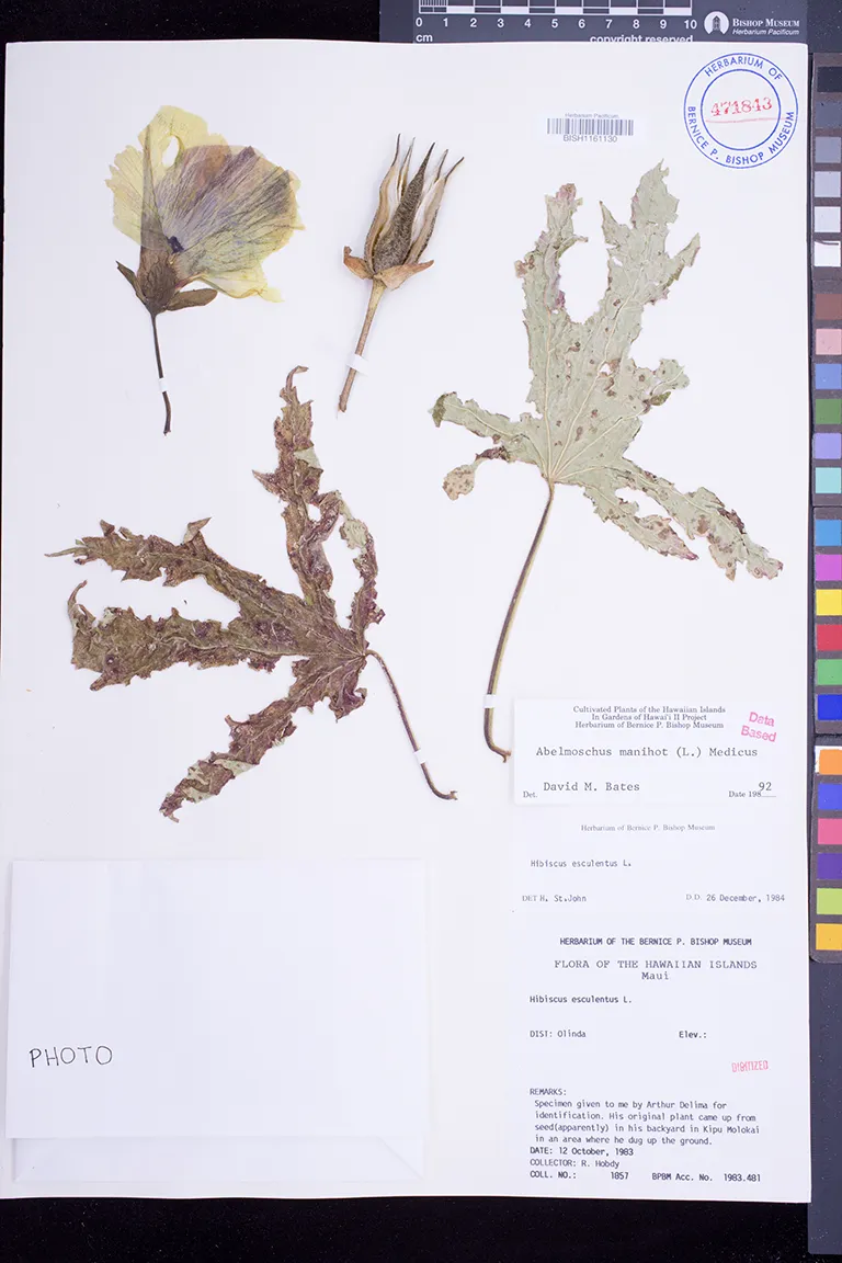 | 5 | Abelmoschus manihot | (L.) Medik. | olinda | PRESERVED_SPECIMEN | hobdy, r.w. | collector number: 1857 | Maui | BISH | 10/12/1983 | |