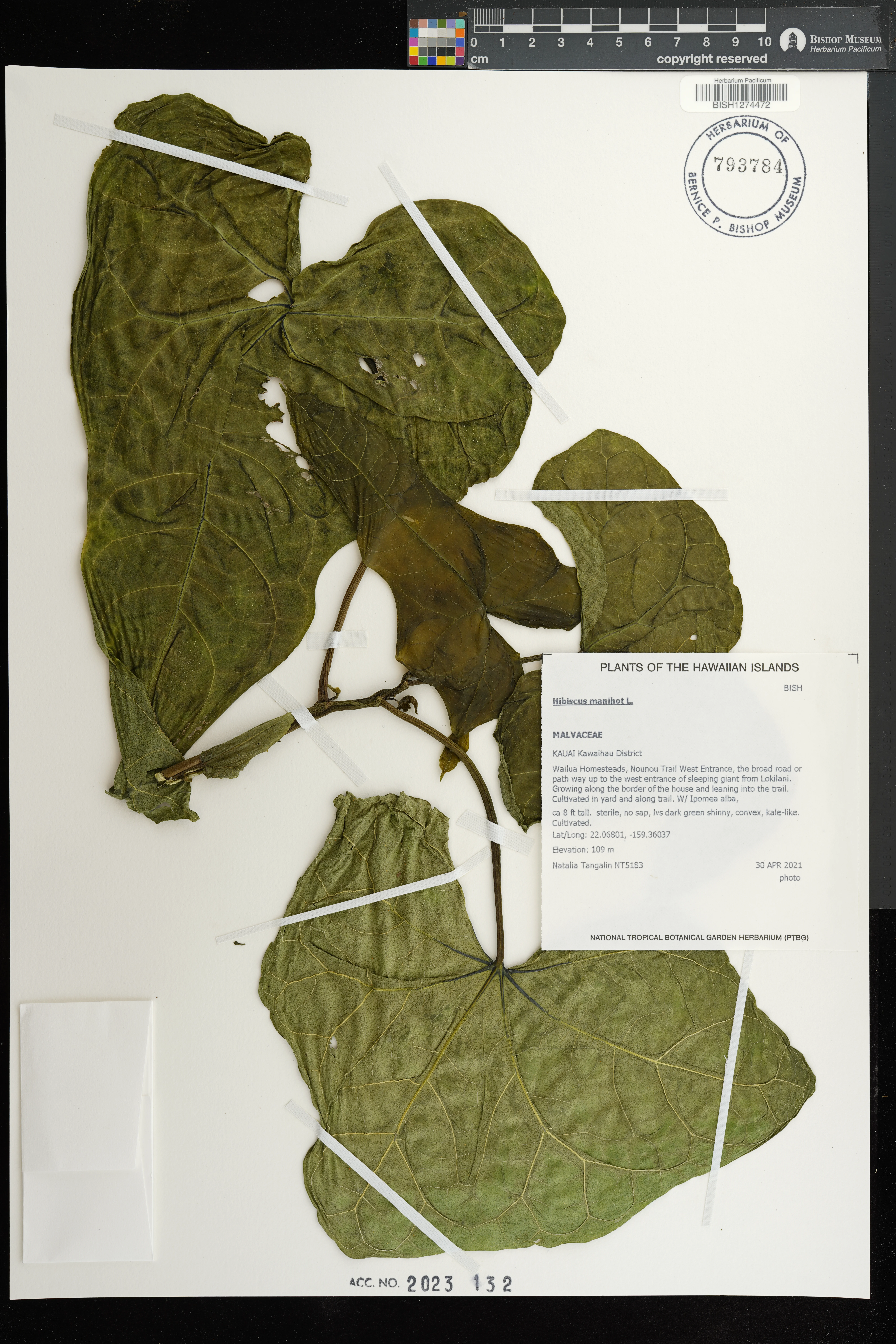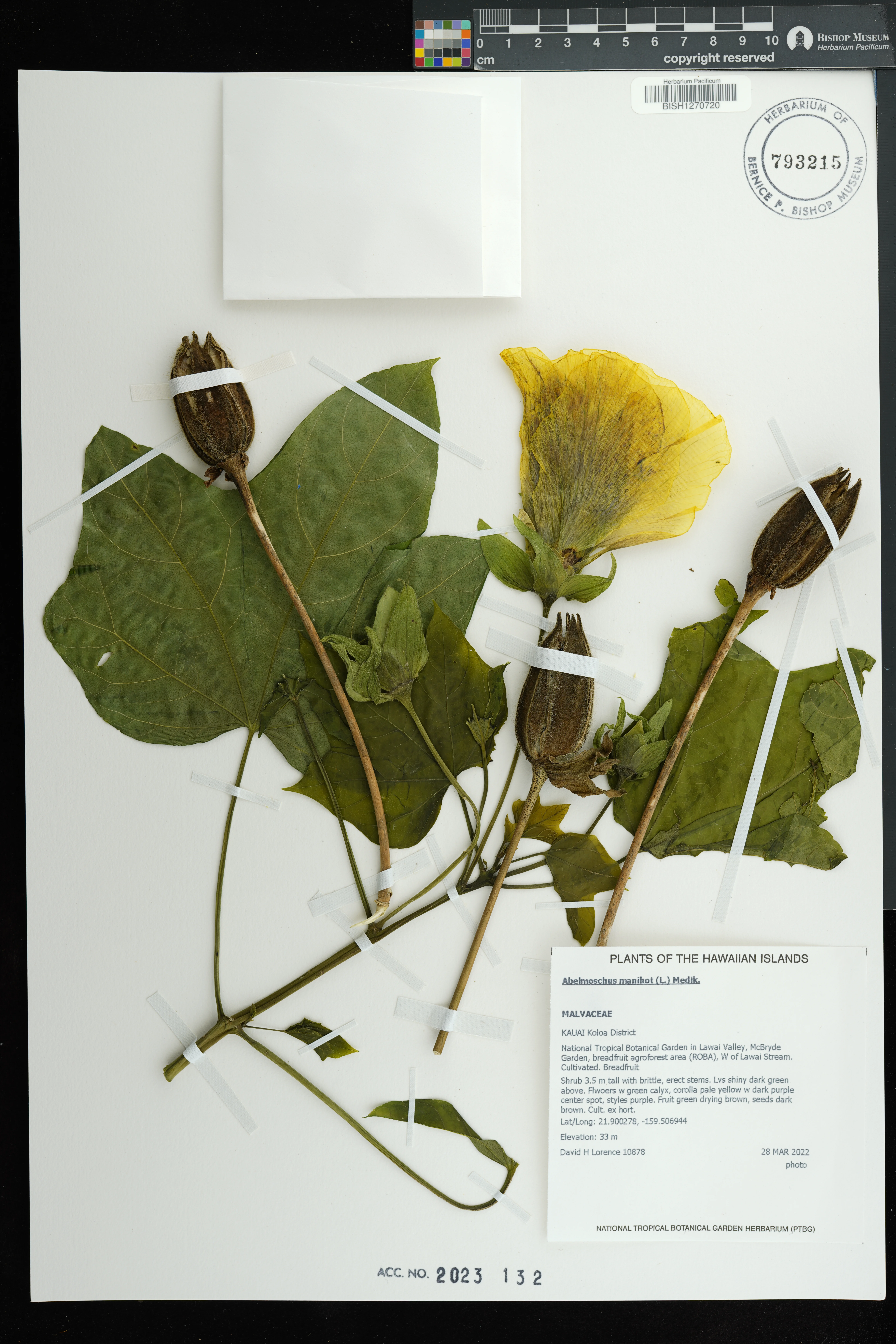 | 9 | Abelmoschus manihot | (L.) Medik. | Kalaheo: yard of house at 3581 Kaloke Street. | PRESERVED_SPECIMEN | David H. Lorence | 7434 | Kauai | PTBG | 12/30/1993 | |