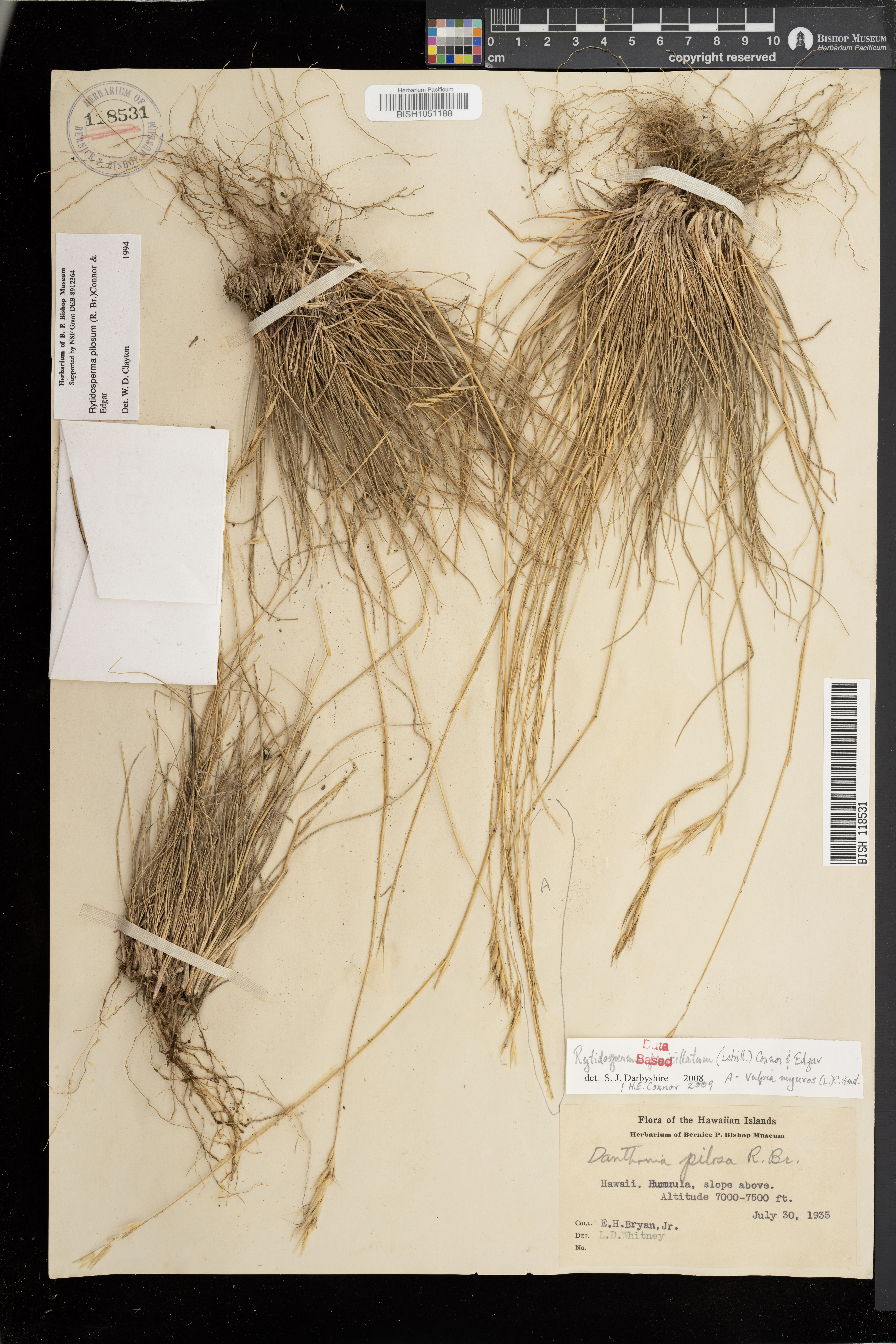 | 2 | Rytidosperma pilosum | (R.Br.) Connor & Edgar | Kamaole, Kula Forest Reserve.Growing alongside the Haleakala Ridge Trail in an area of forestry plants. | PRESERVED_SPECIMEN | Hank Oppenheimer | H70208 | Maui | PTBG | 7/15/2002 | |