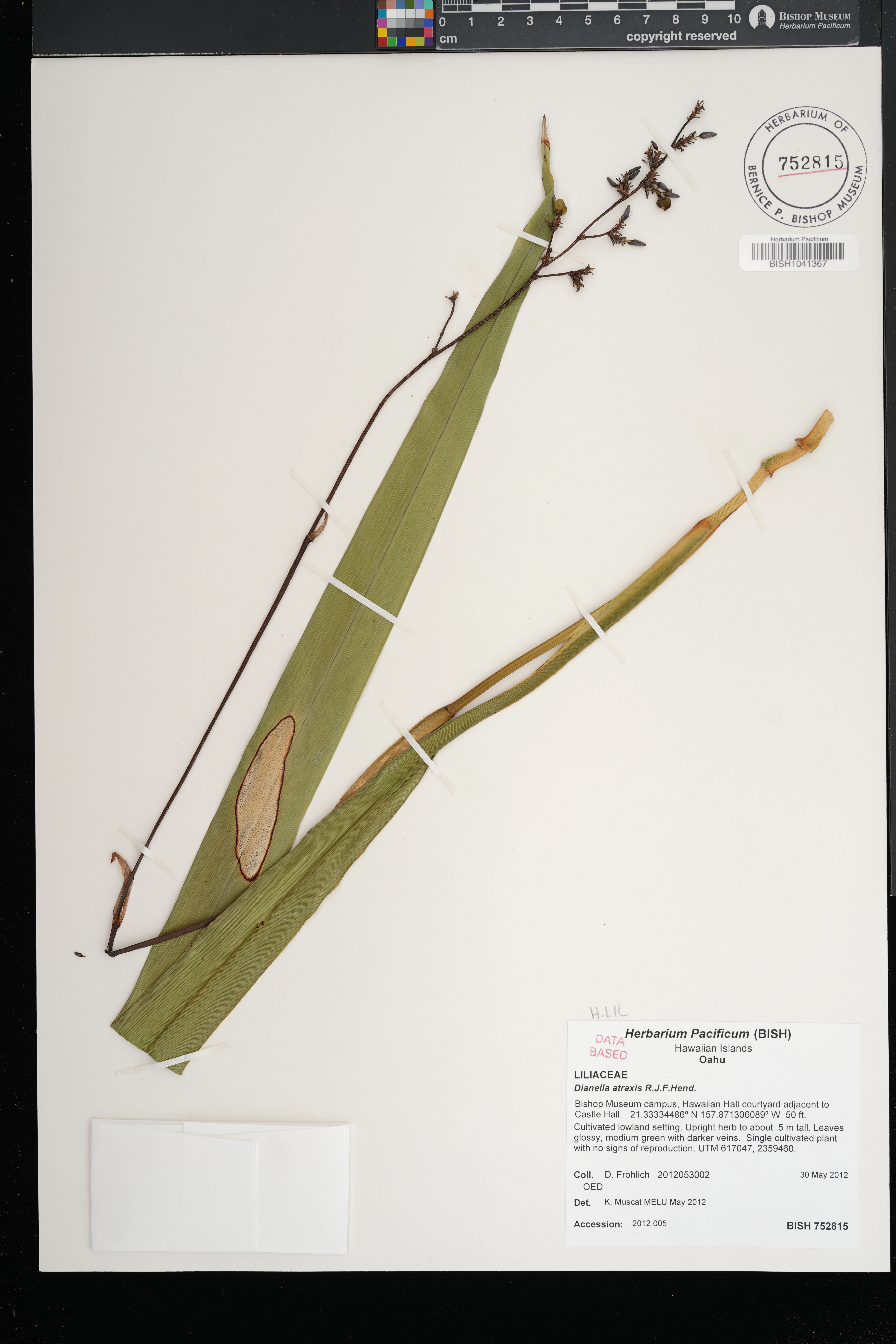 | 4 | Dianella atraxis | R.J.F.Hend. | Bishop Museum campus, Hawaiian Hall courtyard adjacent to Castle Hall. | PRESERVED_SPECIMEN | Frohlich, D. | 2012053002 OED | MELU | 5/30/2012 | ||