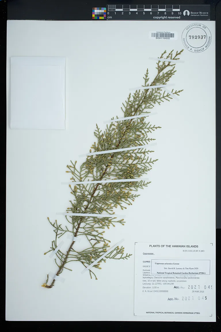 | 3 | Hesperocyparis arizonica | (Greene) Bartel | Kumuwela ridge, along road | Metrosideros-Acacia mesic forest | PRESERVED_SPECIMEN | K. R. Wood | 15452 | Kauai | PTBG | 3/29/2013 |