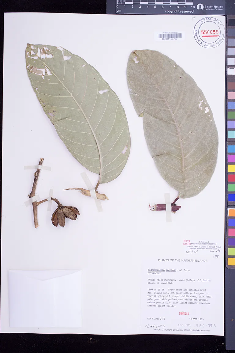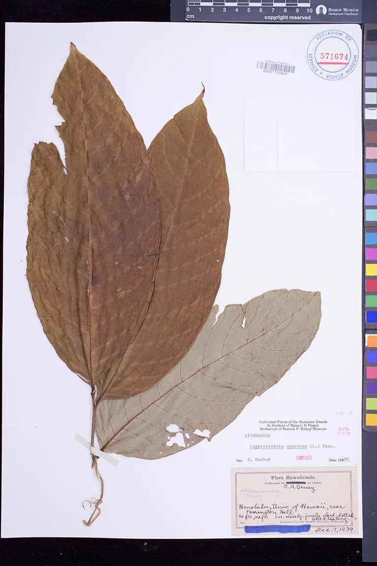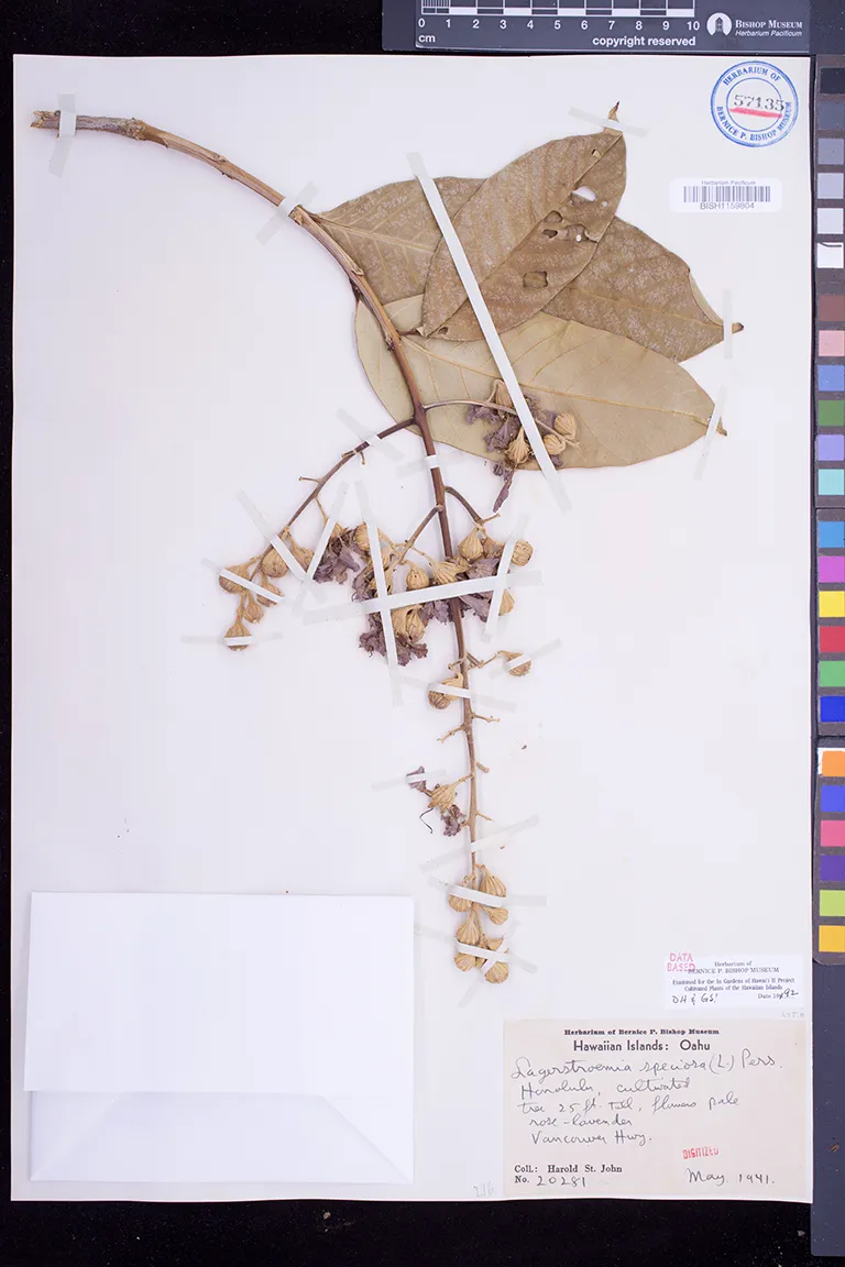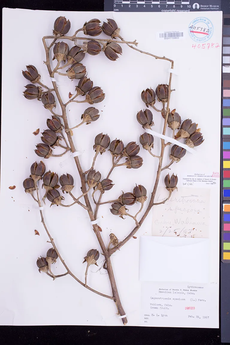 | 2 | Lagerstroemia speciosa | (L.) Pers. | wahiawa | PRESERVED_SPECIMEN | lyon, h.l. | collector number: s.n. | Oahu | BISH | 2/25/1957 | |