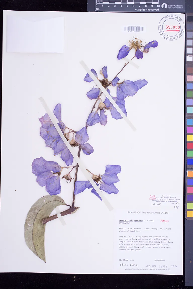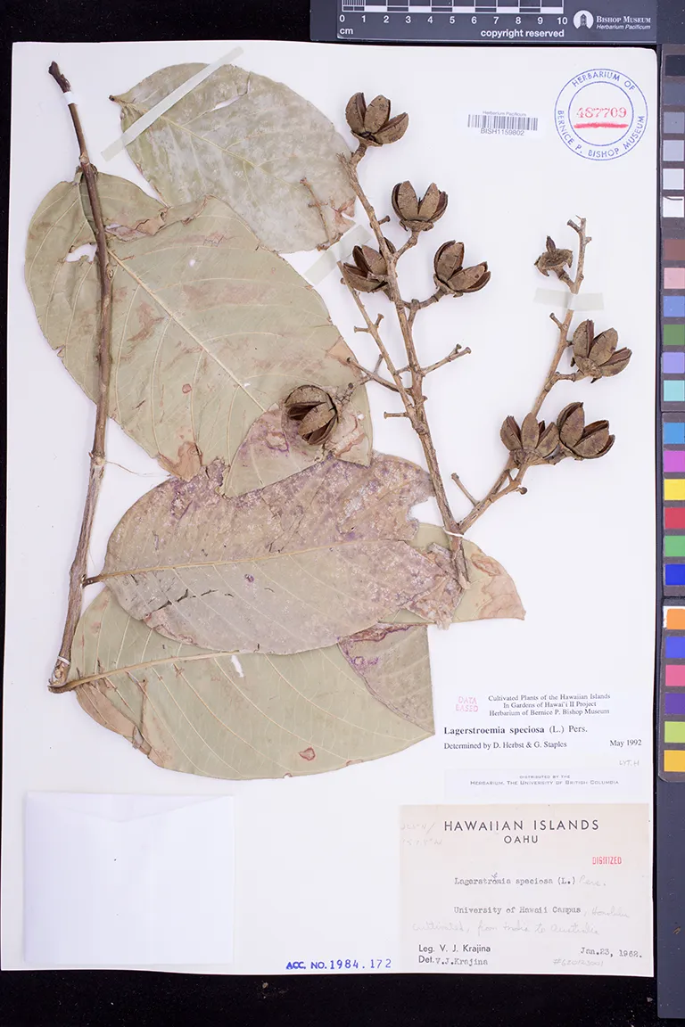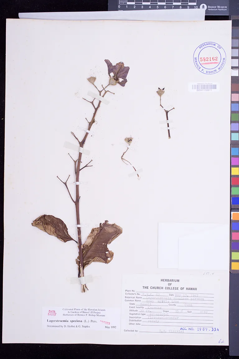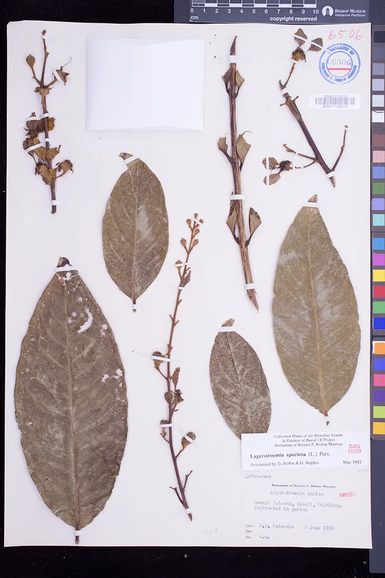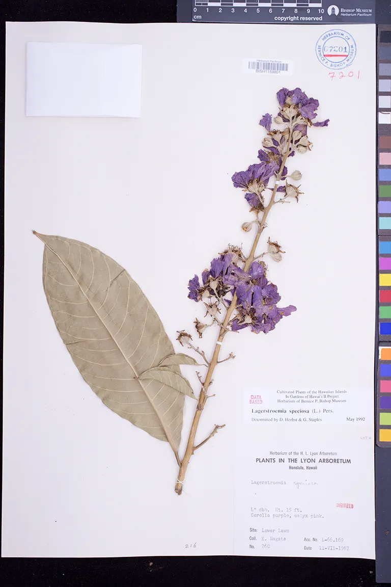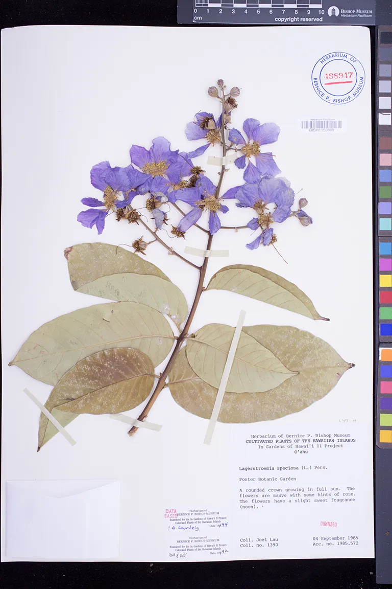 | 8 | Lagerstroemia speciosa | (L.) Pers. | waiohinu | Cultivated in garden. | PRESERVED_SPECIMEN | meinecke, w.h. | collector number: s.n. | Hawaii | BISH | 6/3/1964 |