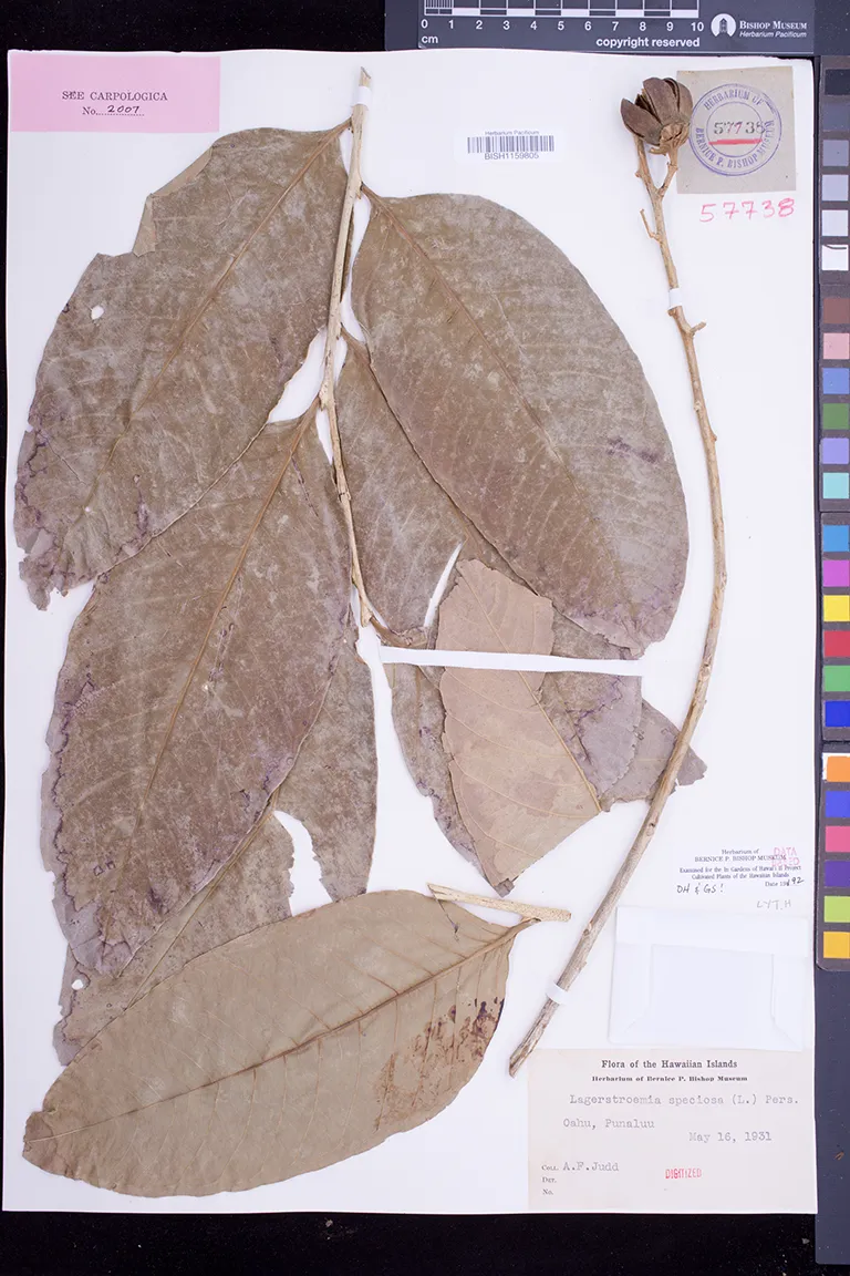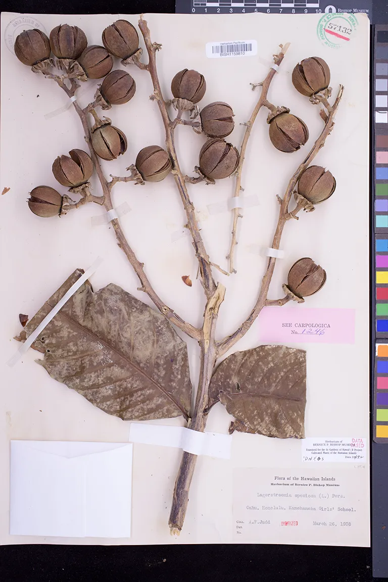 | 10 | Lagerstroemia speciosa | (L.) Pers. | Oahu | PRESERVED_SPECIMEN | Judd Jr., A.F. | s.n. | Oahu | BISH | 5/16/1931 | |
