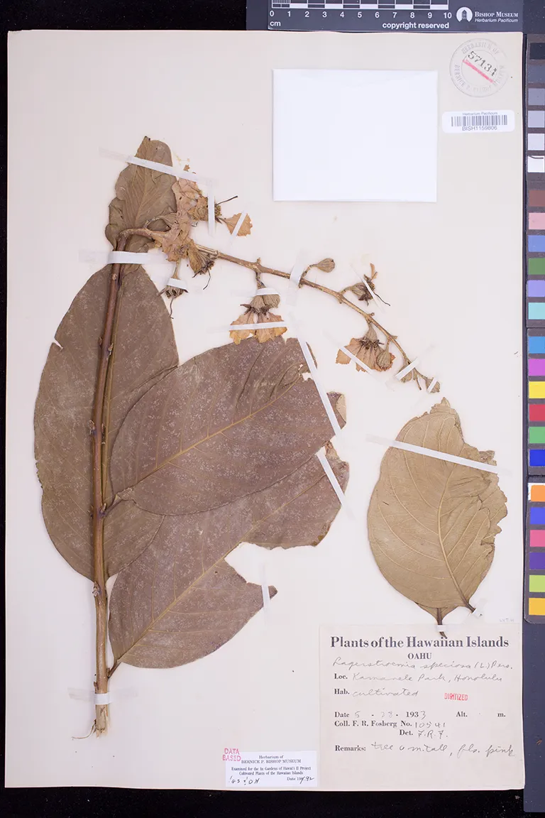 | 37 | Lagerstroemia speciosa | (L.) Pers. | honolulu, vancouver highway | PRESERVED_SPECIMEN | fosberg, f.r. | collector number: 20281 | Oahu | BISH | 5/1/1941 | |