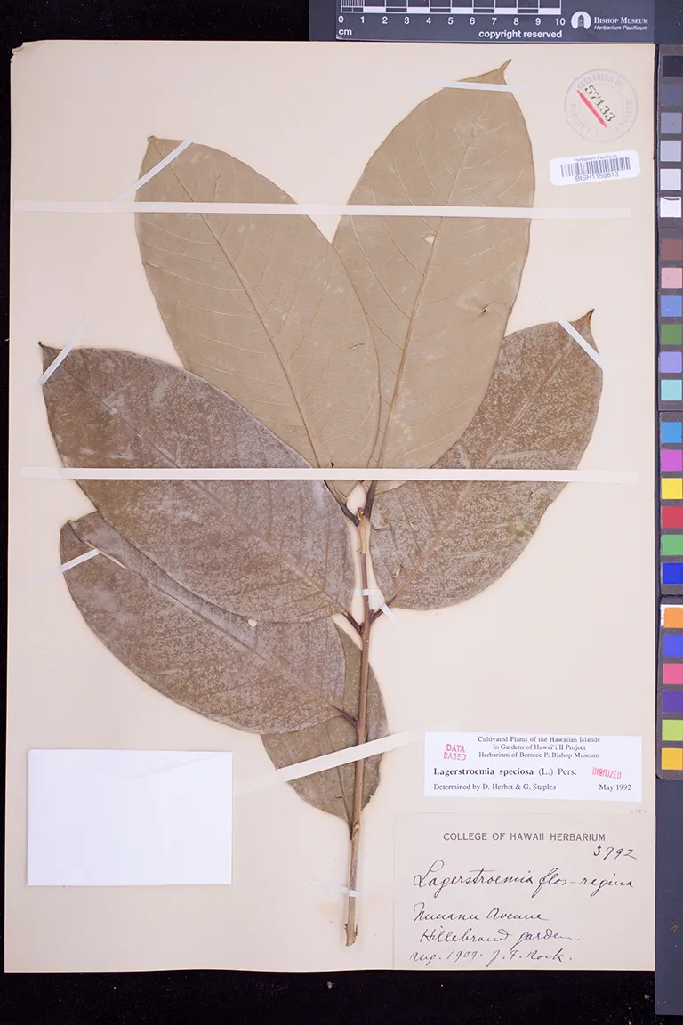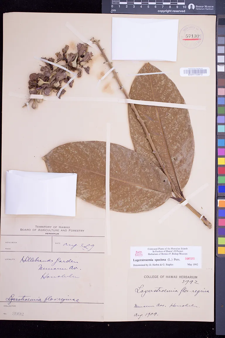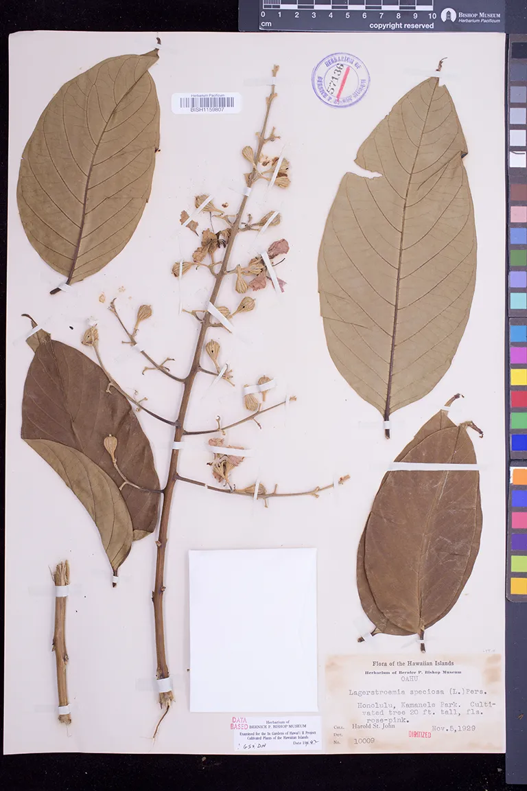 | 31 | Lagerstroemia speciosa | (L.) Pers. | honolulu; nuuanu avenue; hillebrands garden | PRESERVED_SPECIMEN | anon. | collector number: 3992 | Molokai | BISH | 8/8/1909 | |