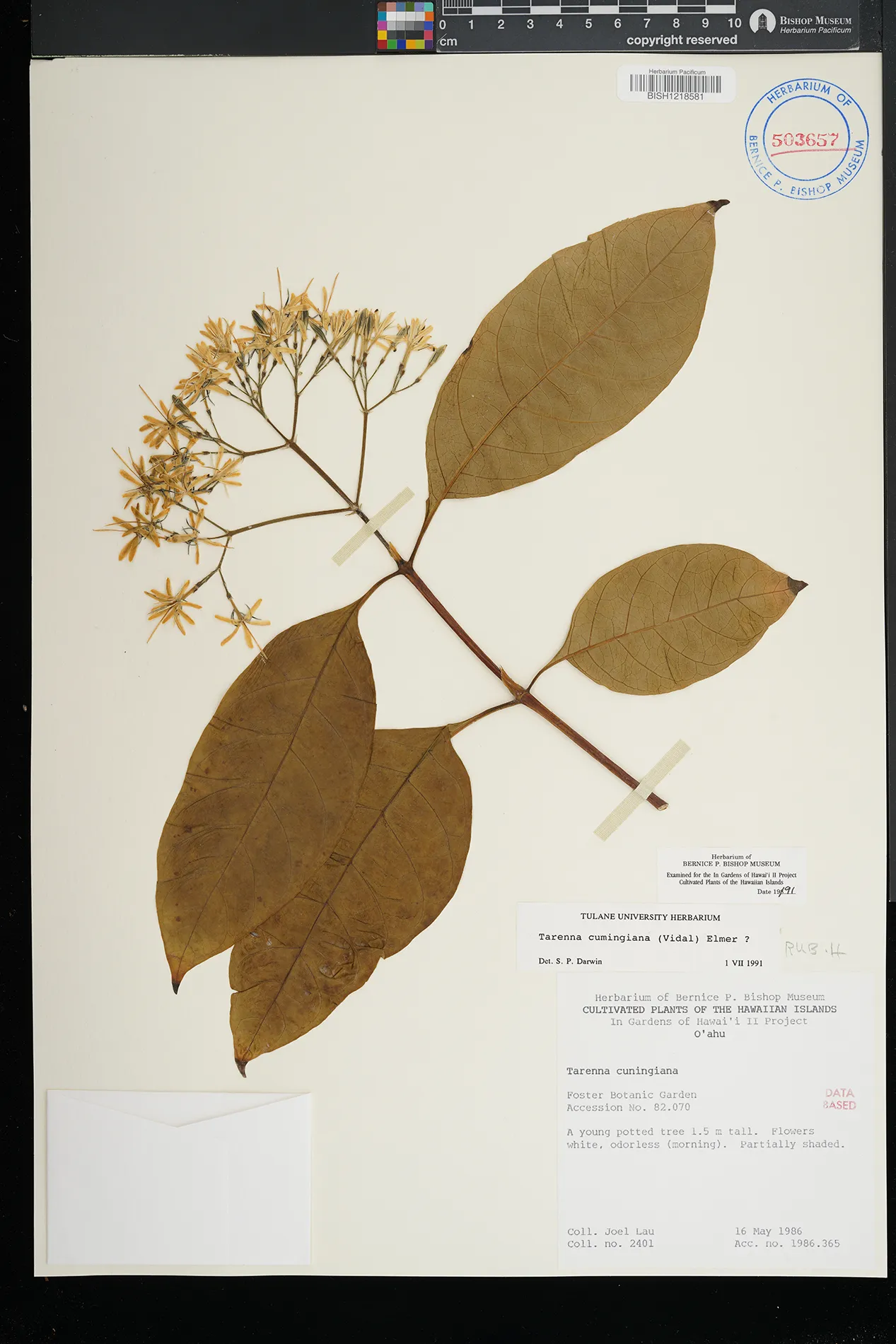 | 2 | Tarenna cumingiana | (S.Vidal) Elmer | foster botanic garden | Partially shaded | PRESERVED_SPECIMEN | lau, j. | collector number: 2401 | Oahu | BISH | 5/16/1986 |
