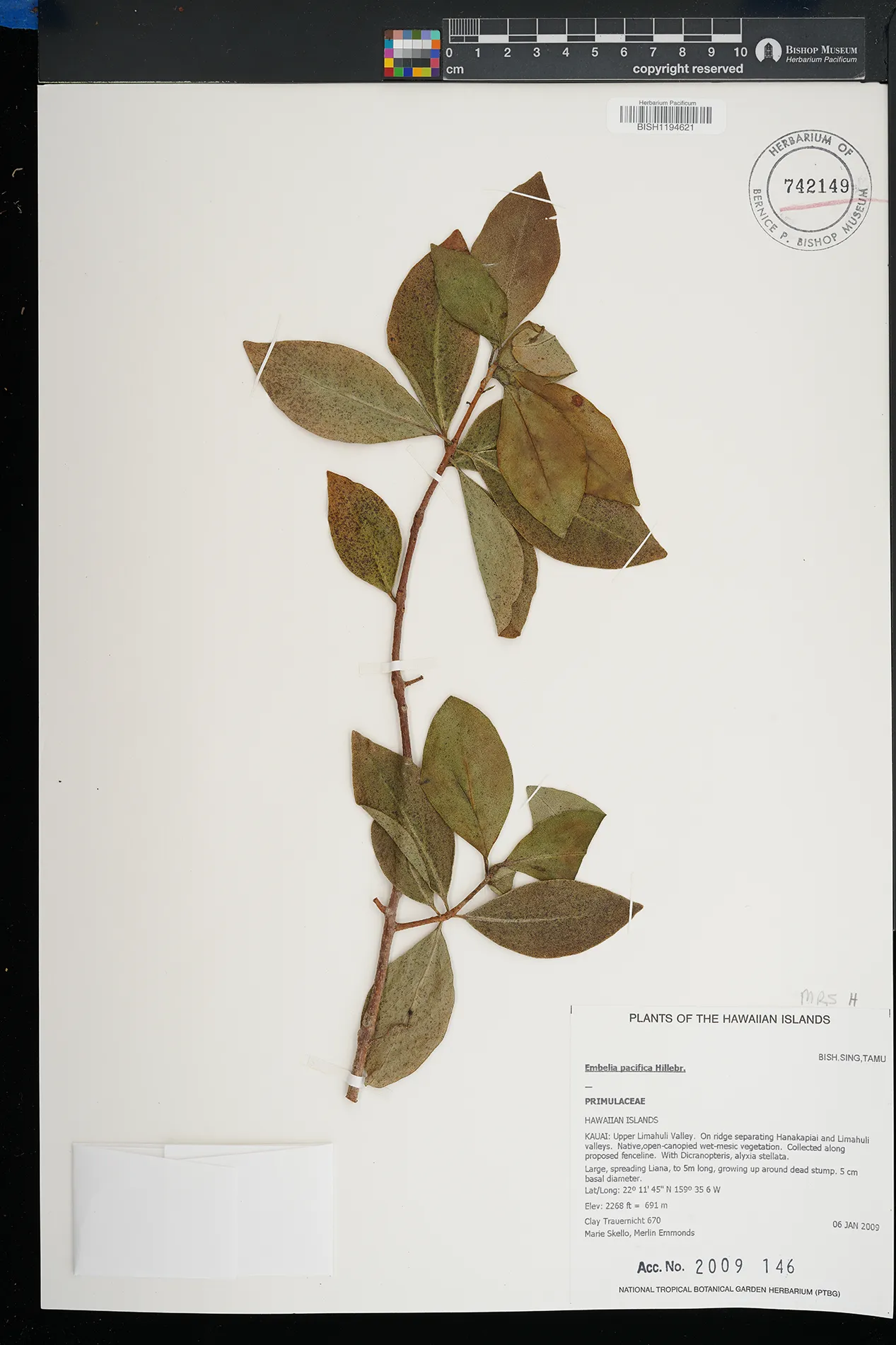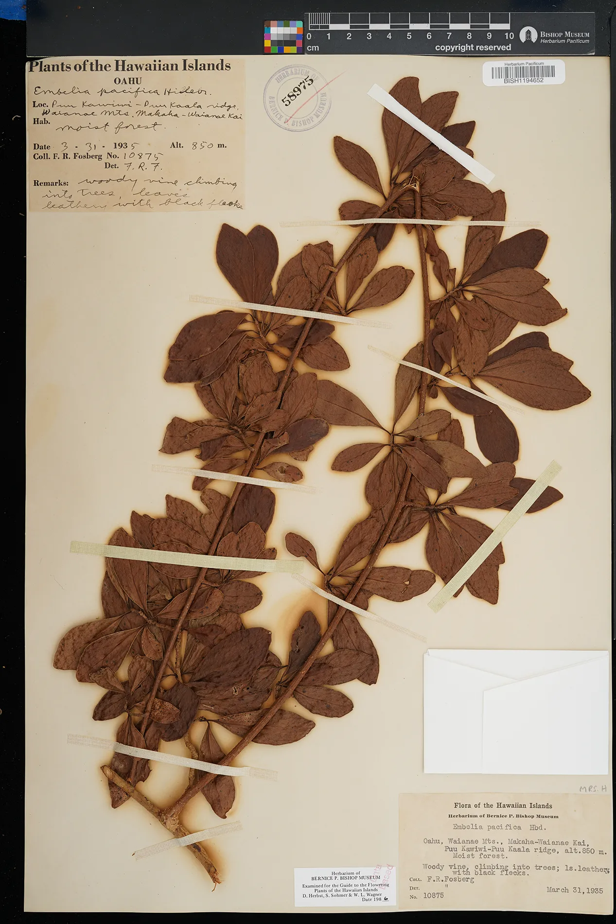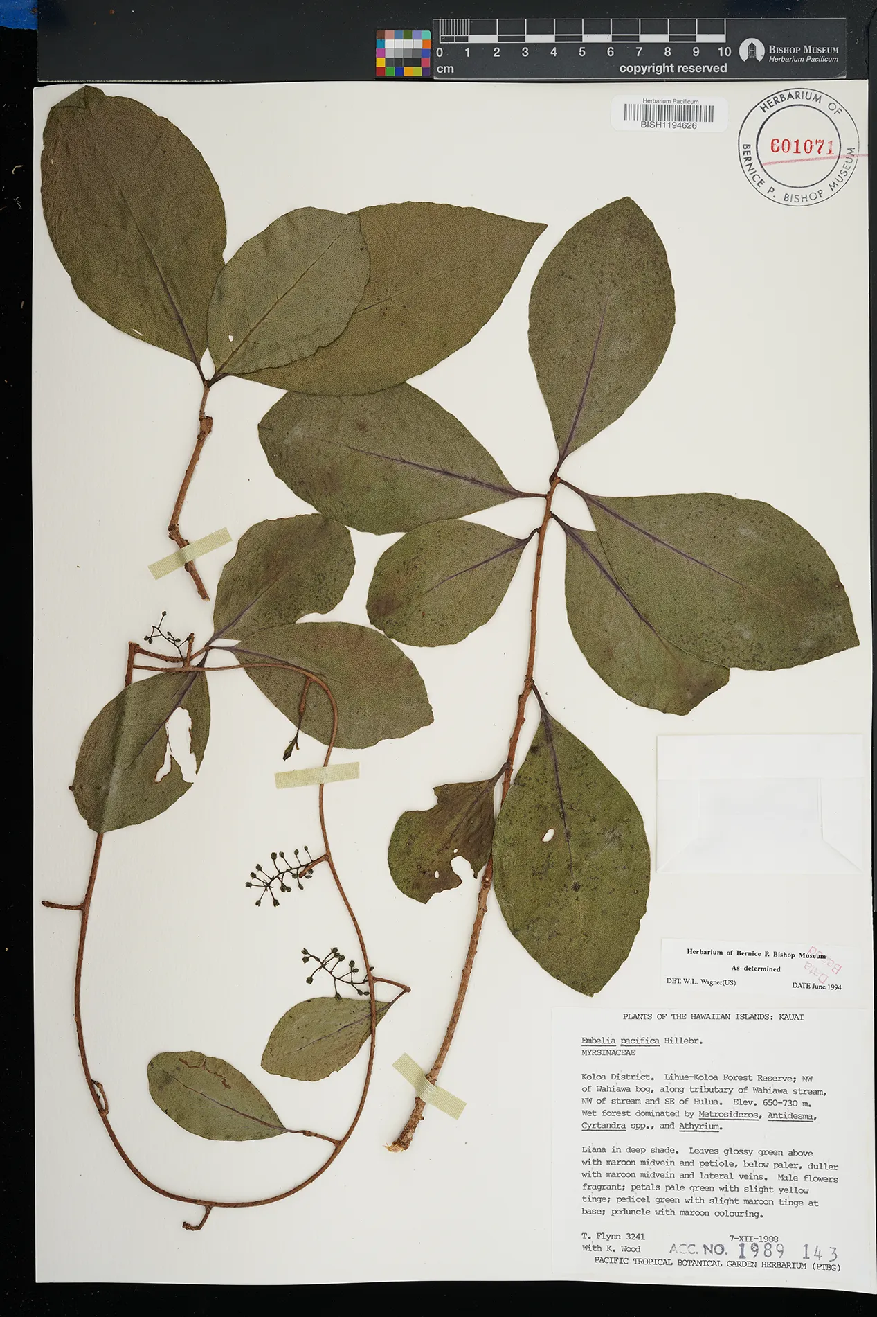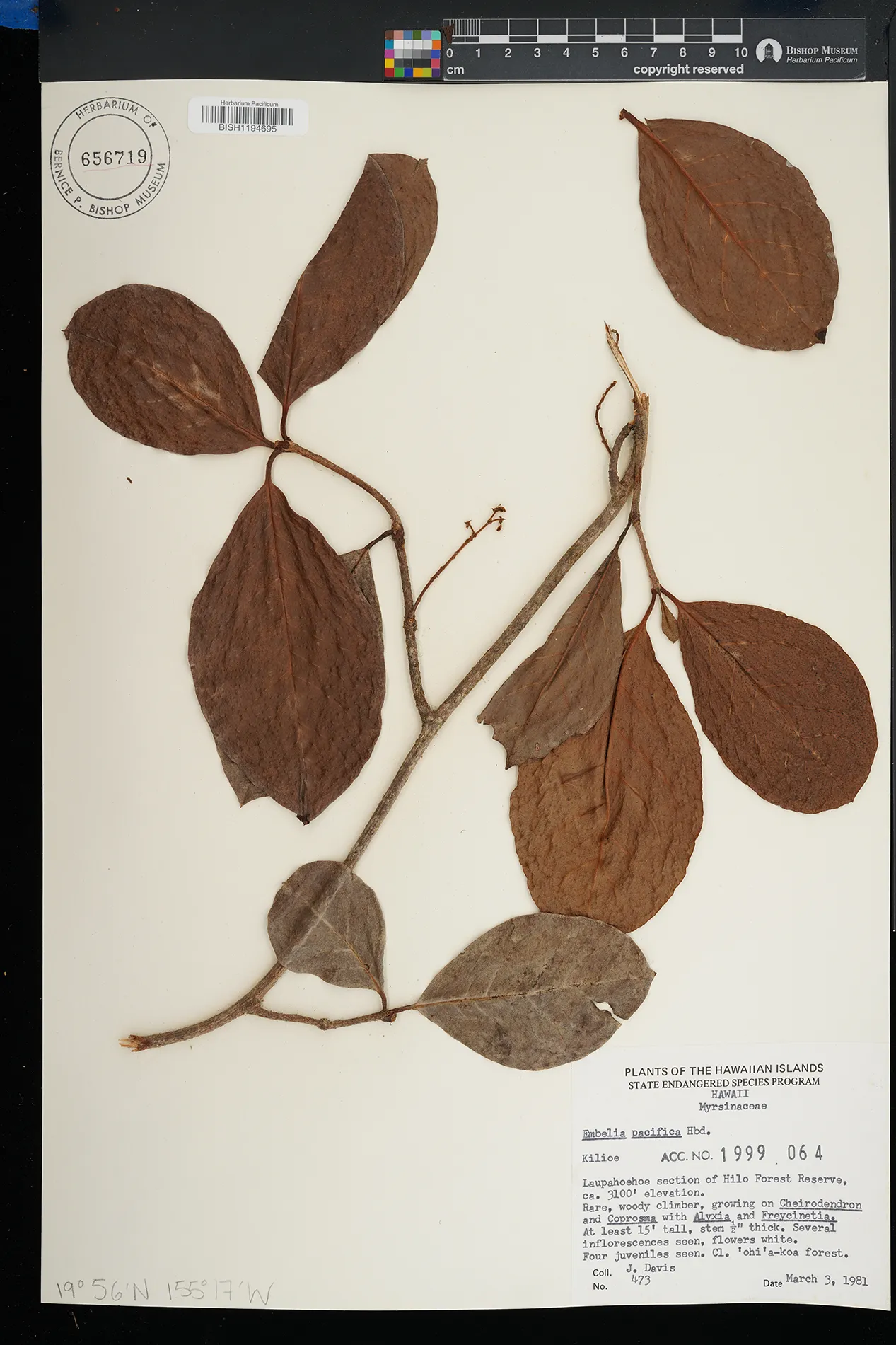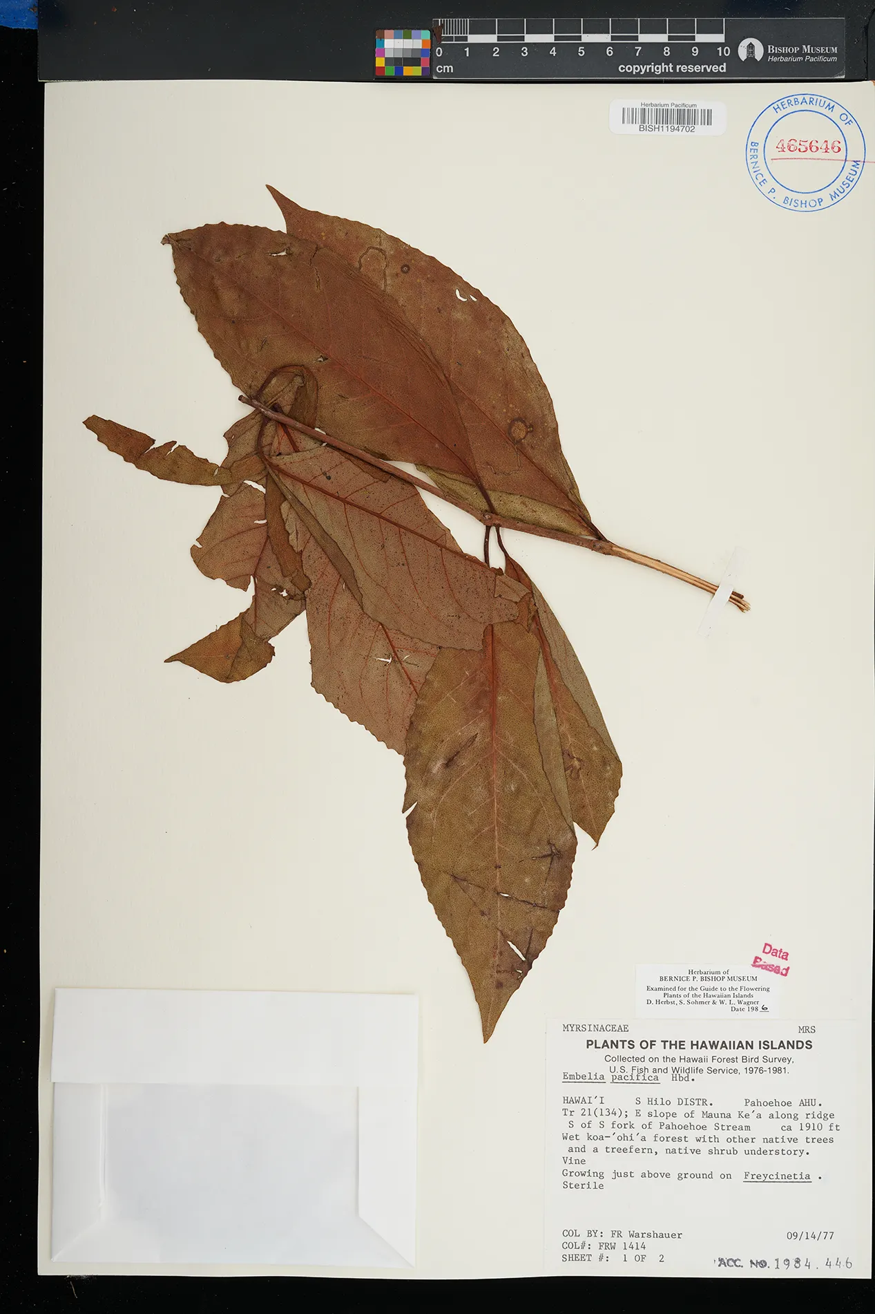 Wet koa-'ohi'a forest with other native trees and a treefern, native shrub understory. Growing just above ground on Freycinetia |