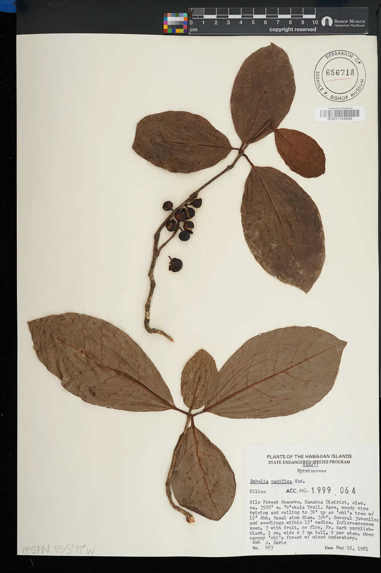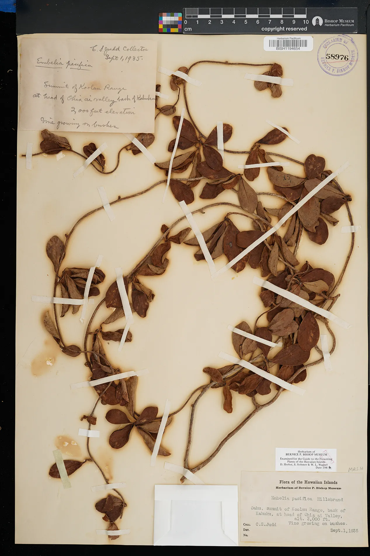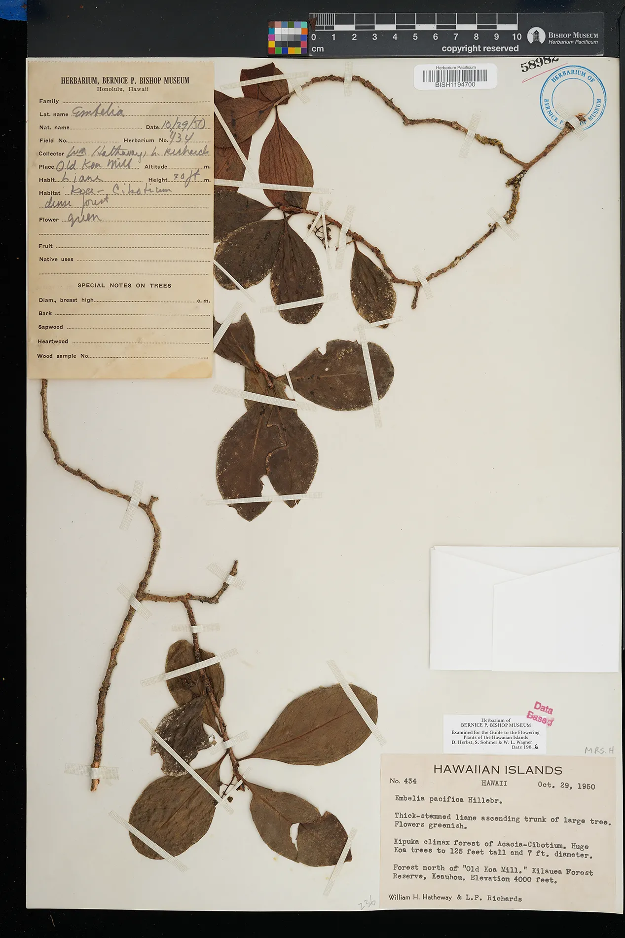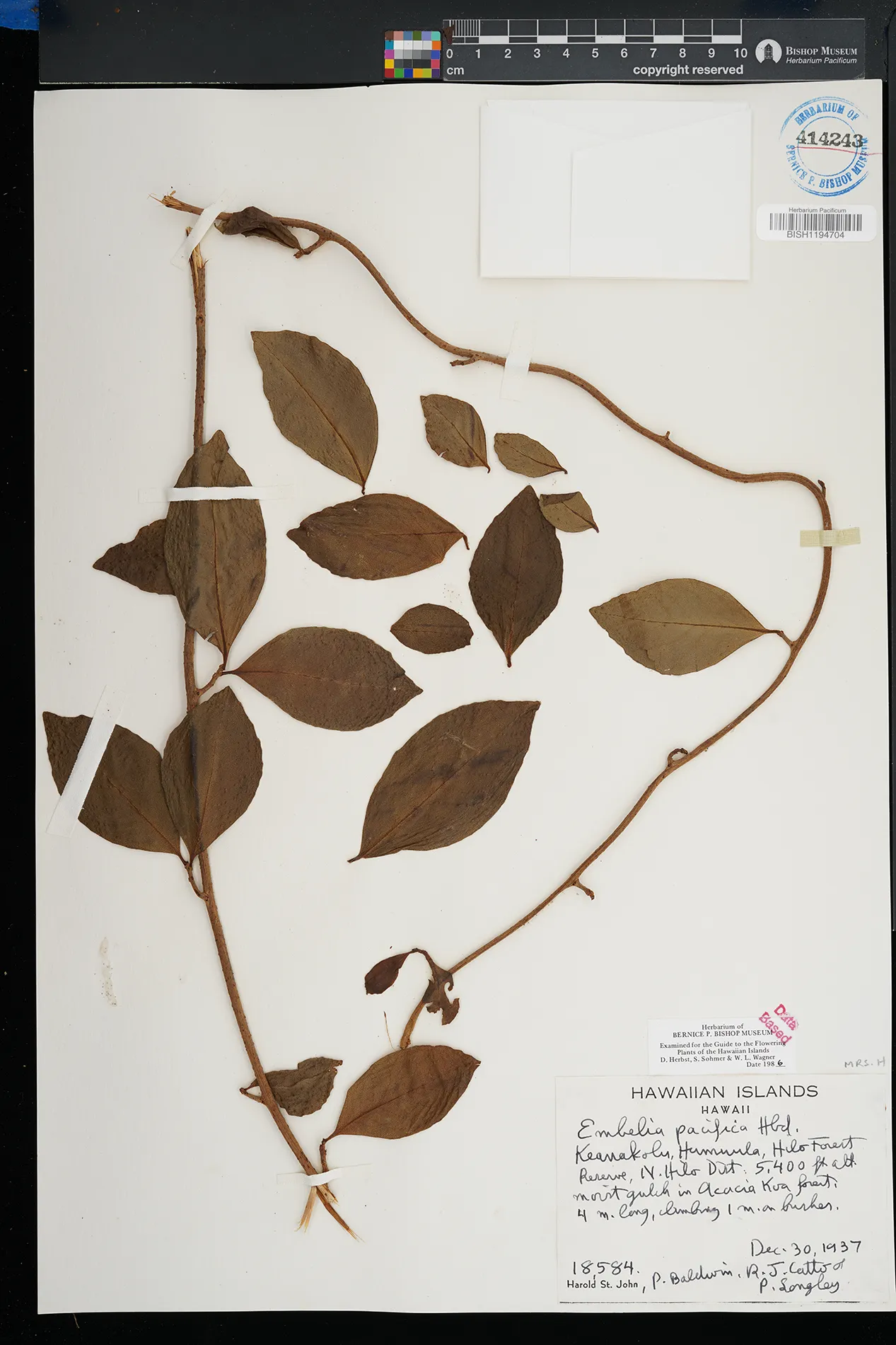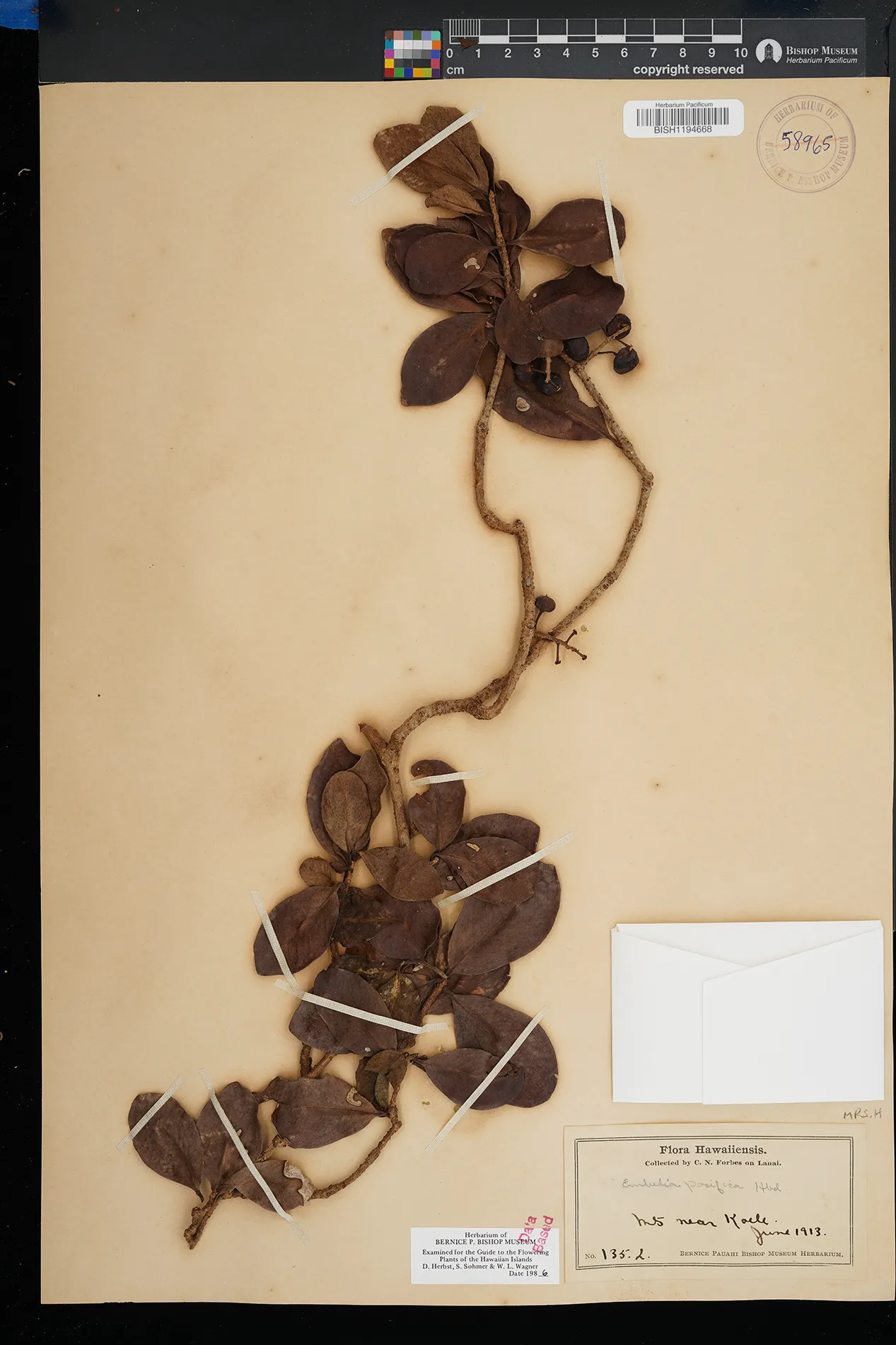 Wet koa-'ohi'a forest with other native trees and a treefern, native shrub understory. Growing just above ground on Freycinetia |