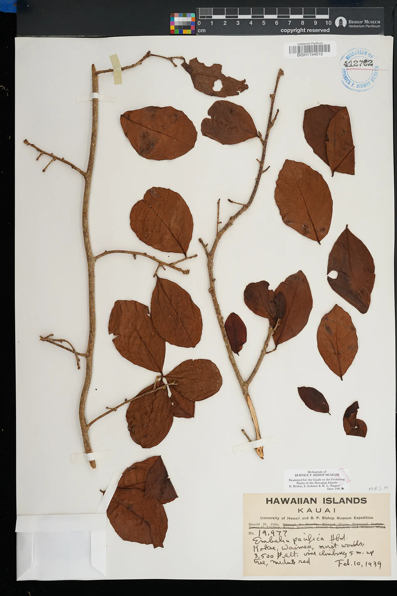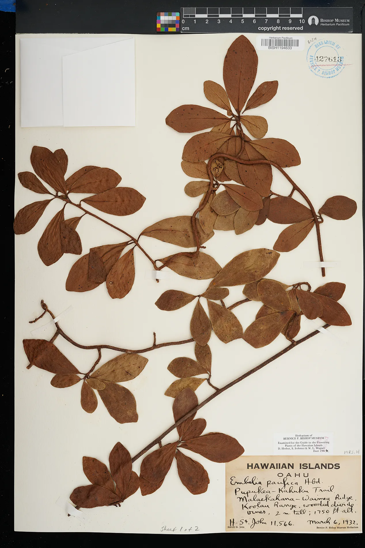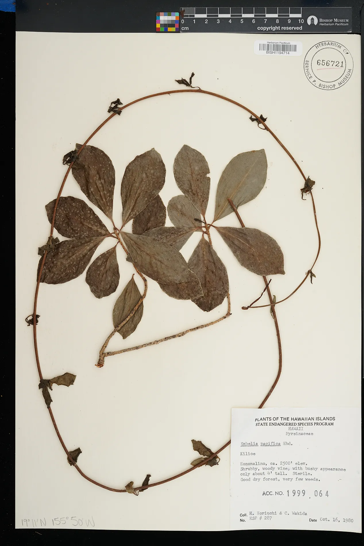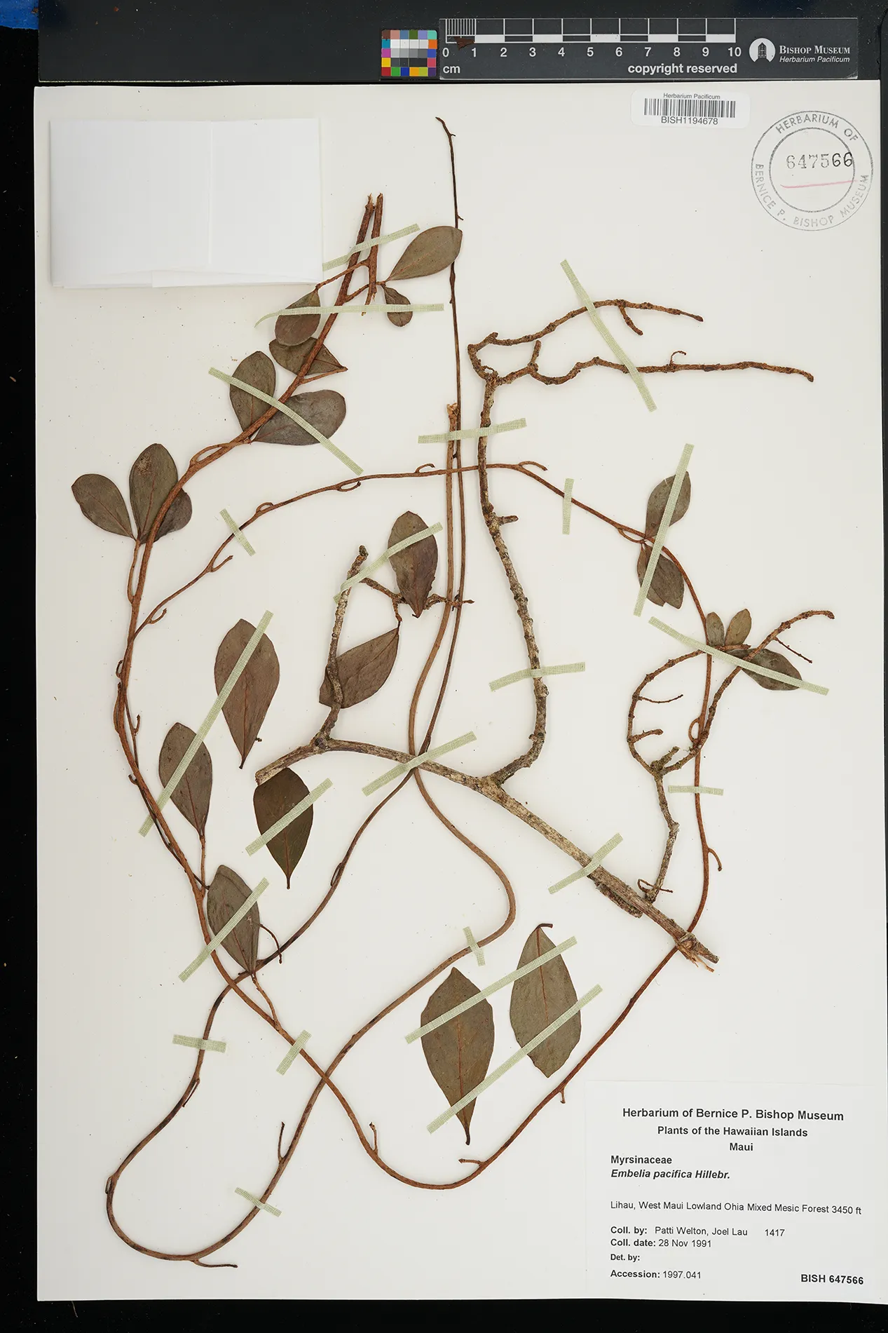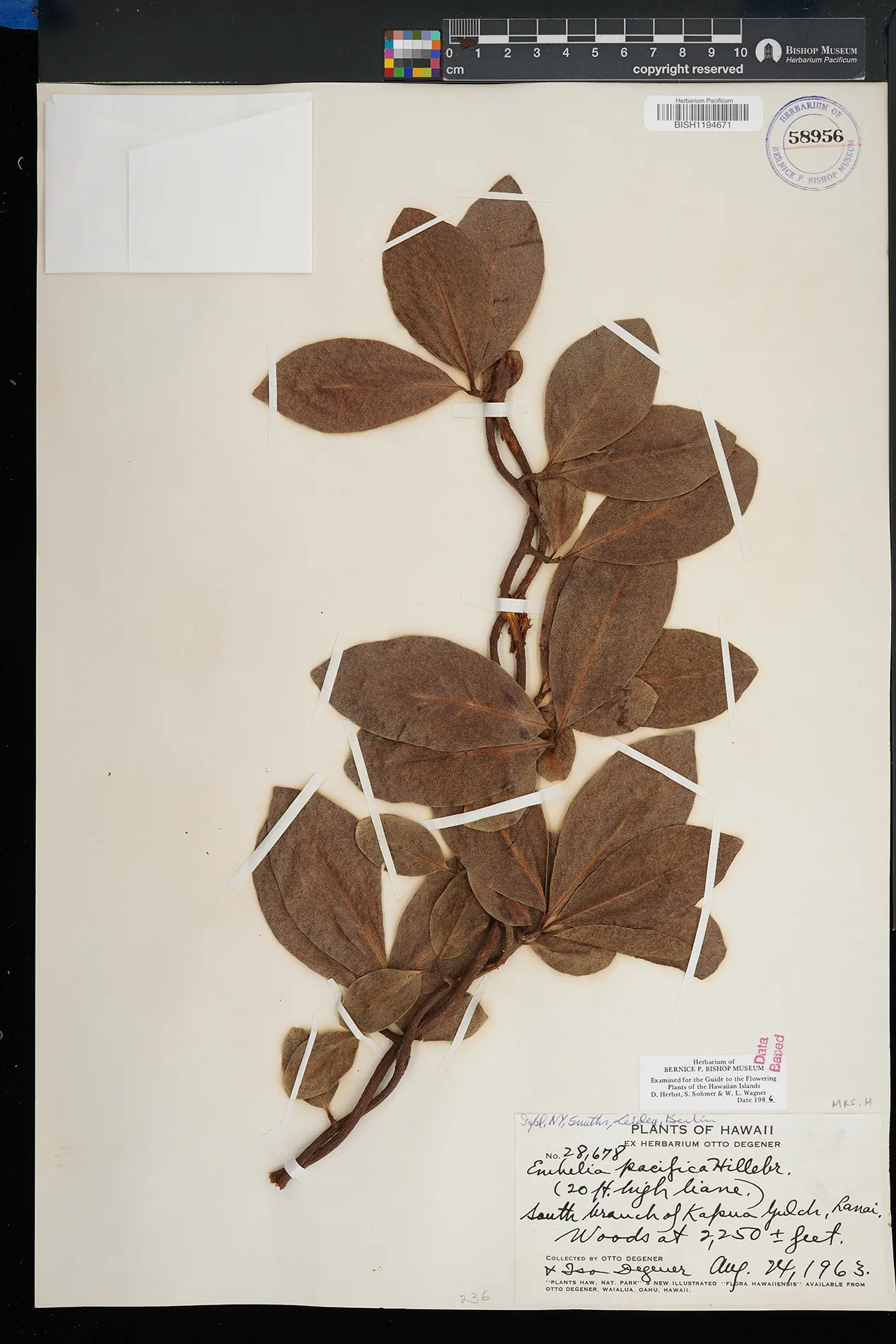 Wet koa-'ohi'a forest with other native trees and a treefern, native shrub understory. Growing just above ground on Freycinetia |