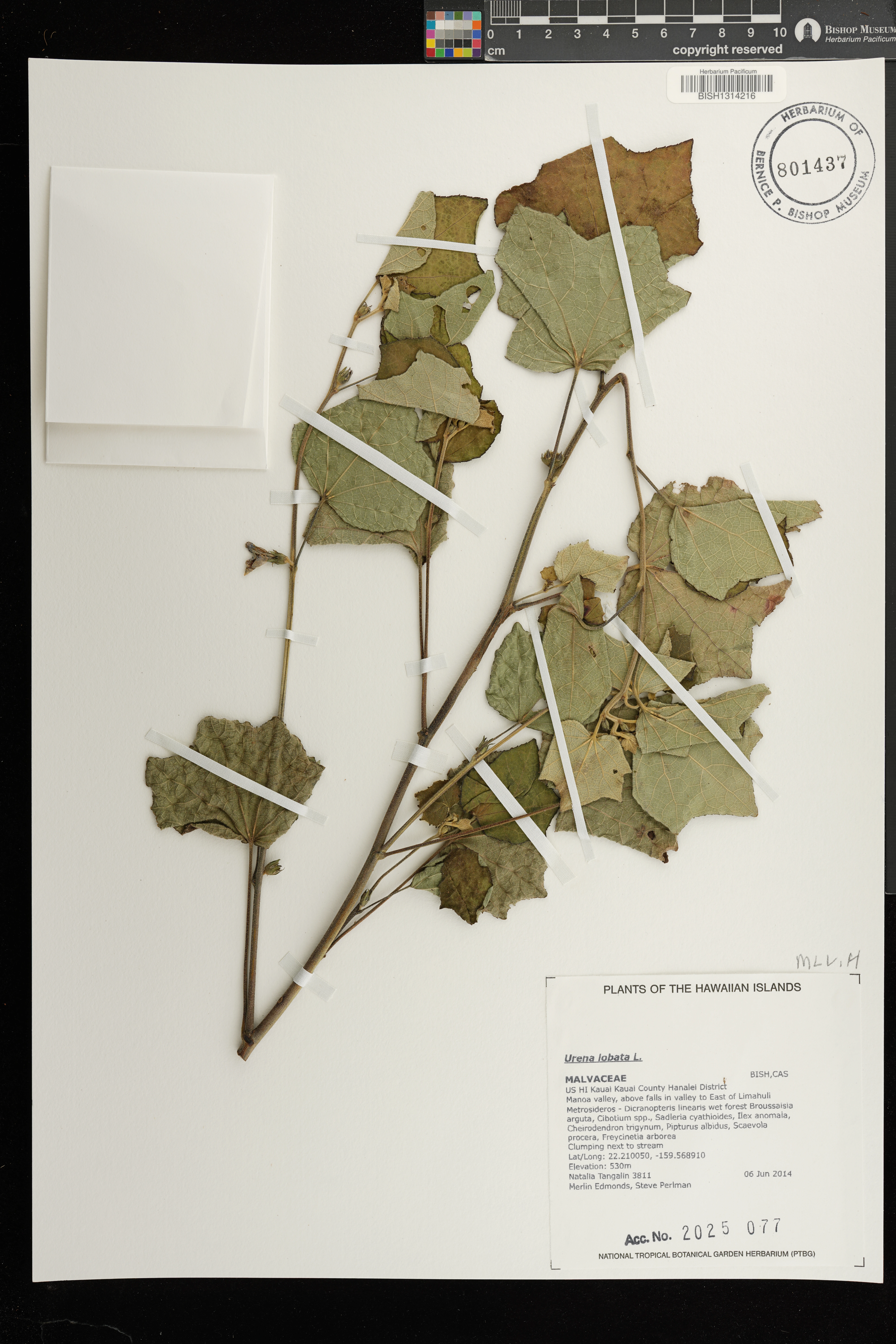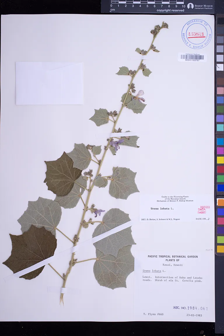 | 14 | Urena lobata | L. | lawai. intersection of waha and lauoho roads | PRESERVED_SPECIMEN | flynn, t. | collector number: 660 | Kauai | BISH | 11/23/1983 | |