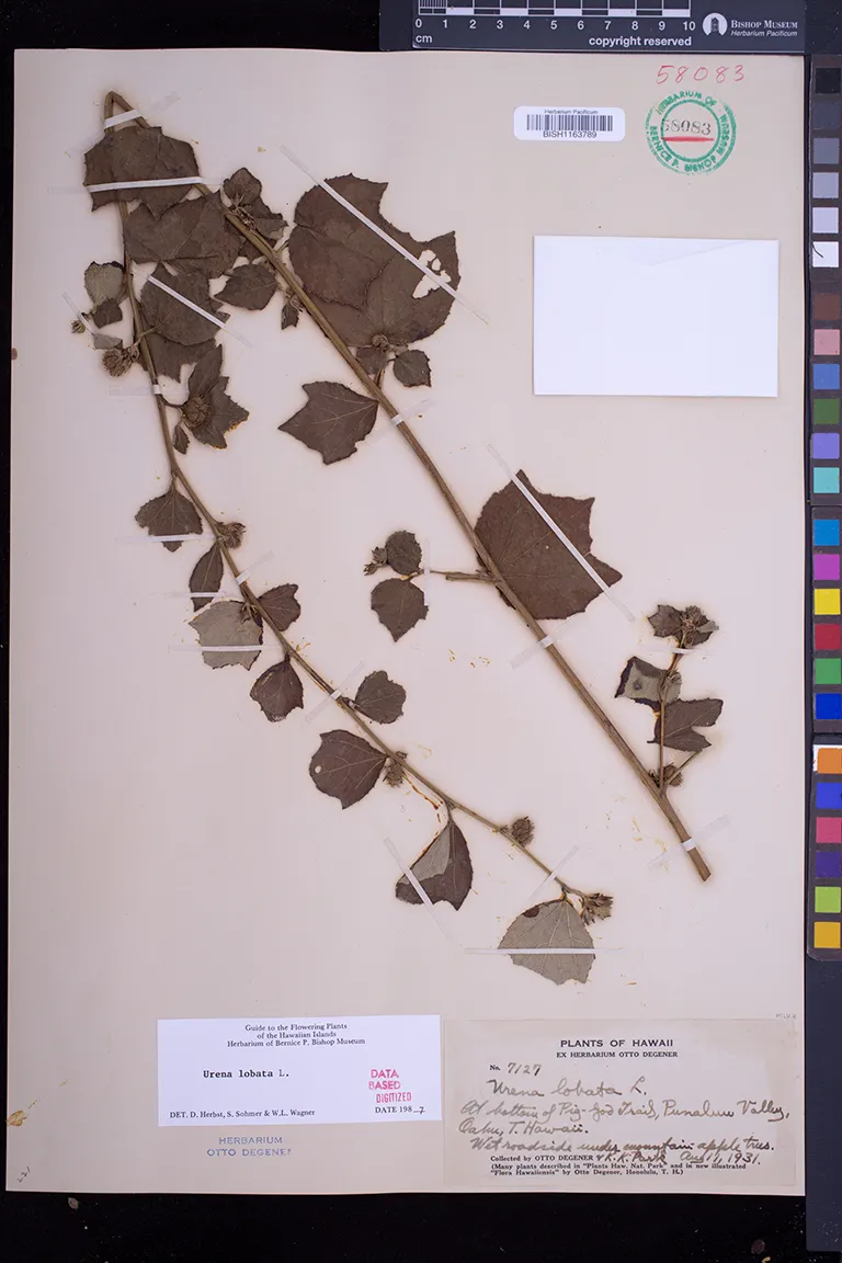 | 31 | Urena lobata | L. | waiahole trail | PRESERVED_SPECIMEN | kerr, m. | collector number: s.n. | Oahu | BISH | 8/18/1946 |
