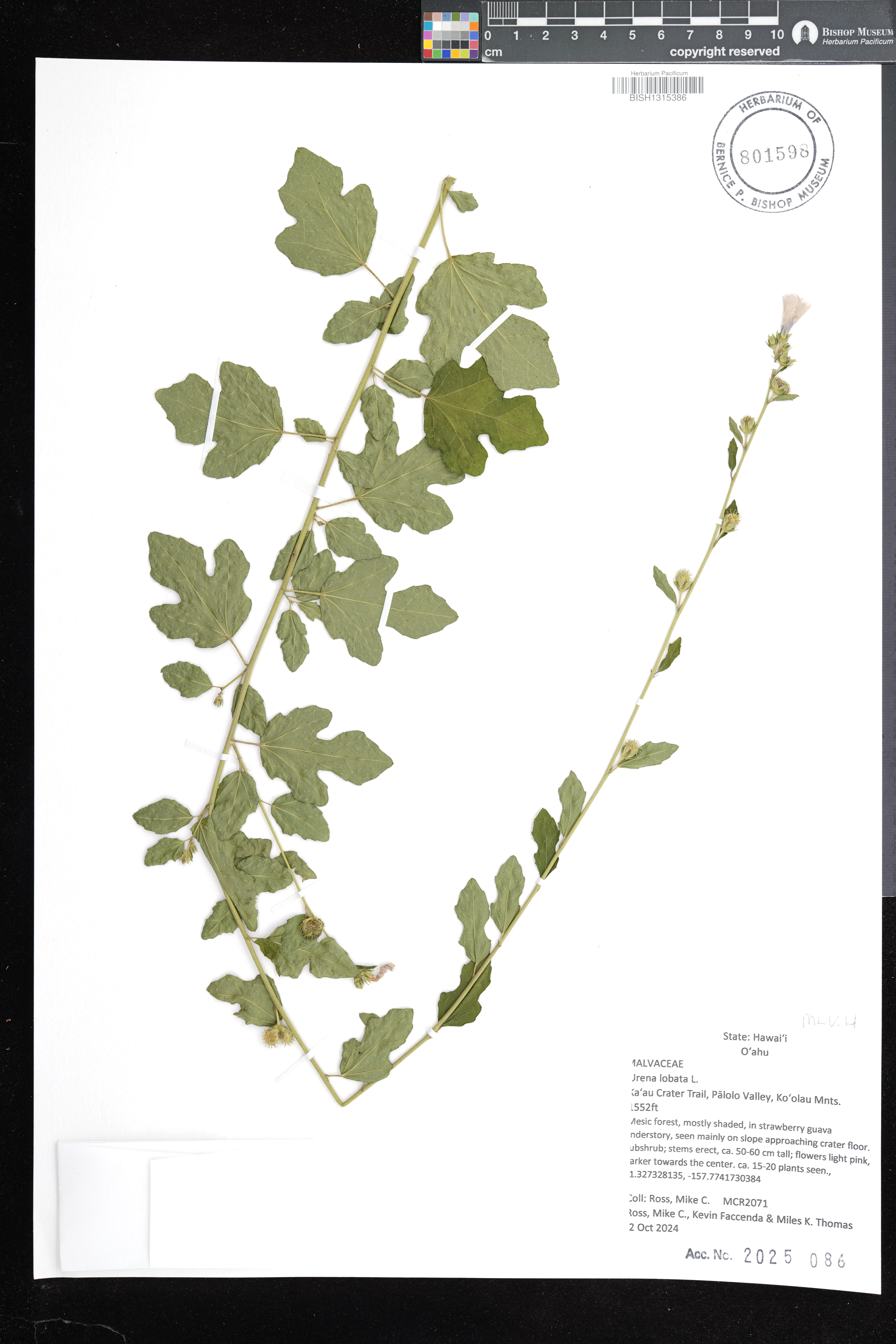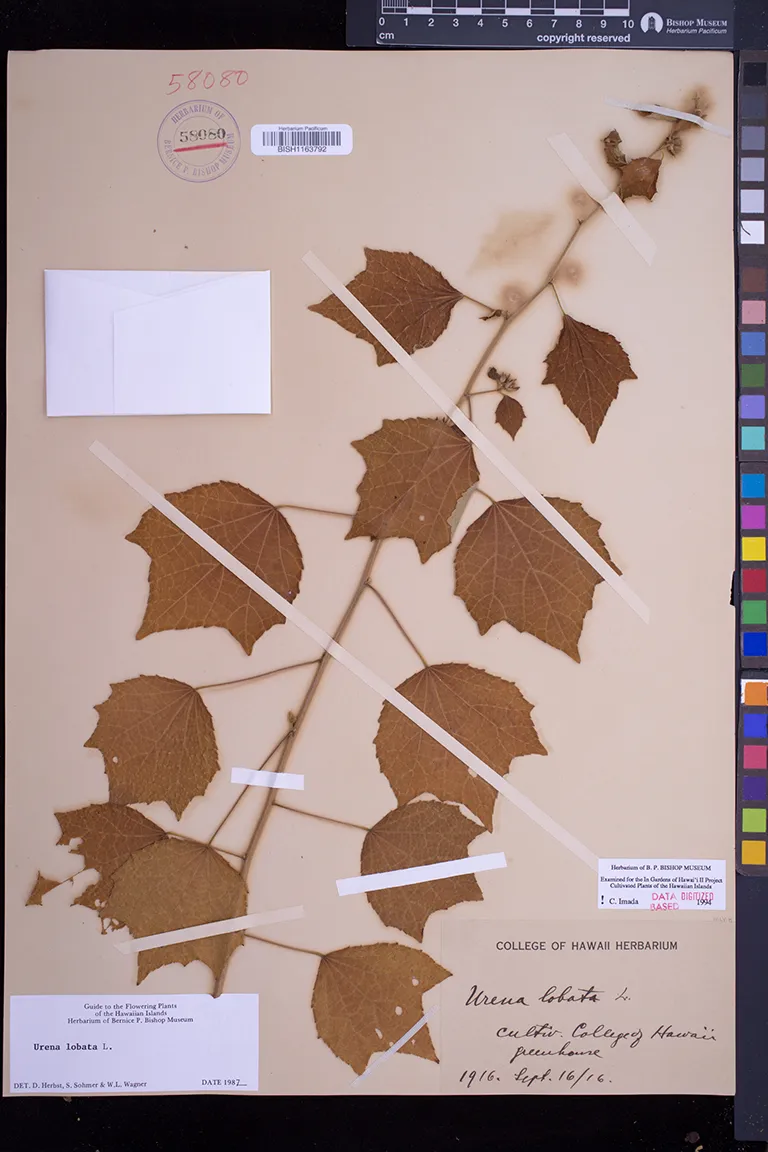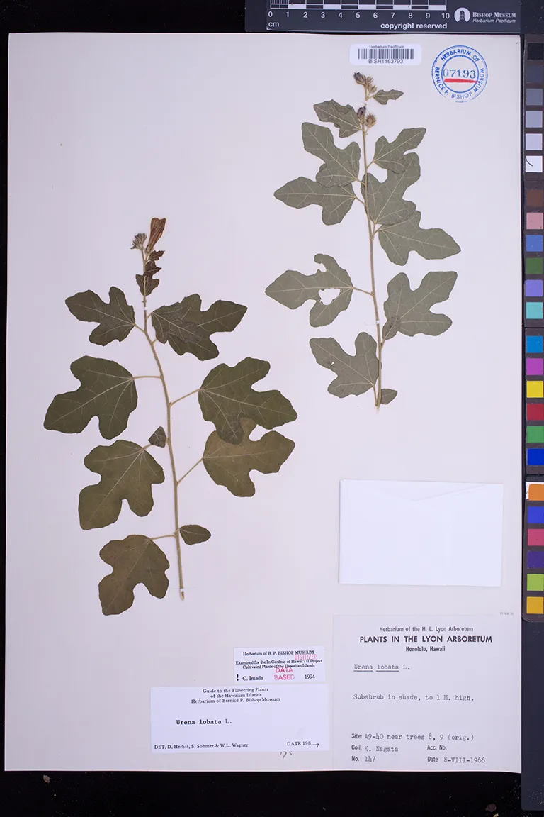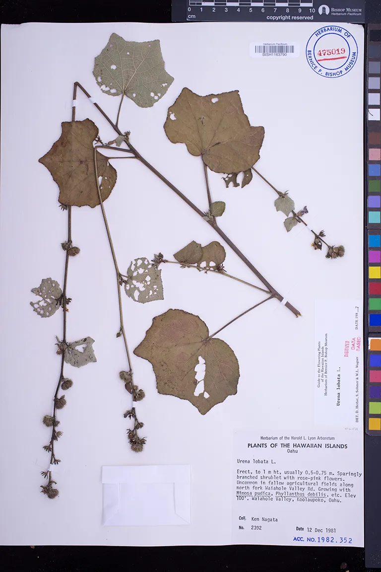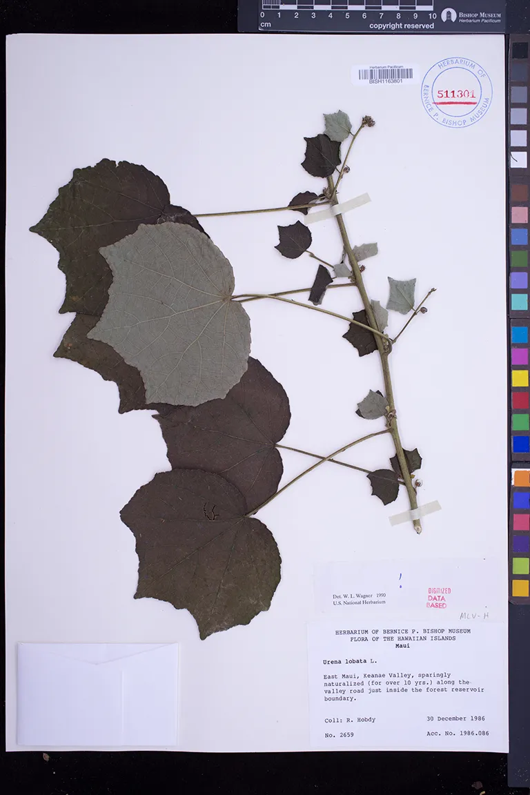 | 12 | Urena lobata | L. | East Maui, Keanae Valley, Along the valley road just inside the forest reservoir boundary | PRESERVED_SPECIMEN | Hobdy, R.W. | 2659 | Maui | BISH | 12/30/1986 | |