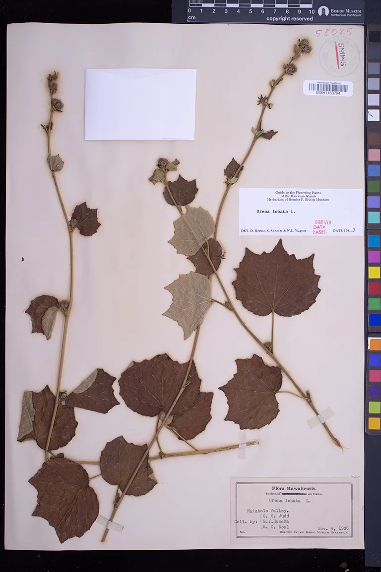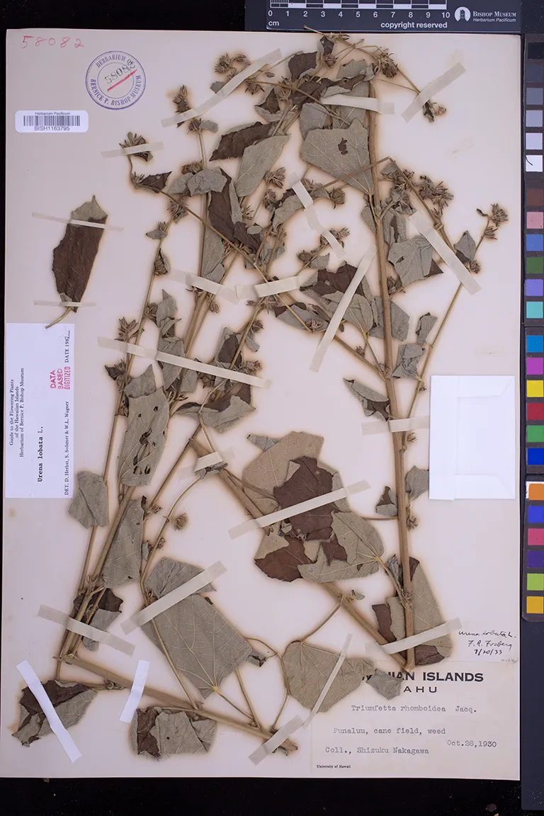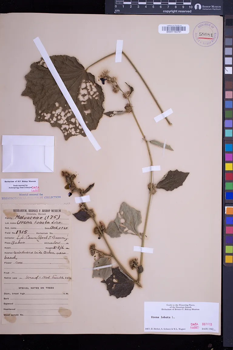 | 4 | Urena lobata | L. | oahu | Windward side Oahu near beach. | PRESERVED_SPECIMEN | caum, e.l. brown, b.f. | collector number: 1315 | Oahu | BISH | 10/1/1924 |