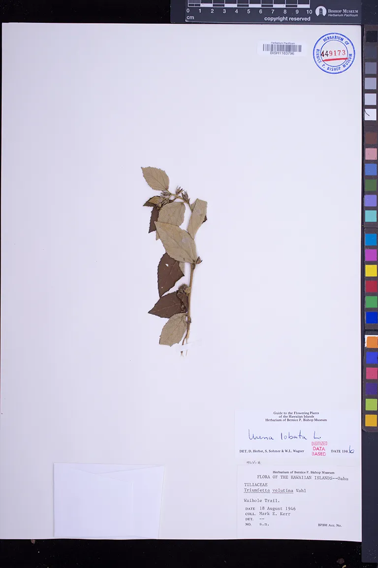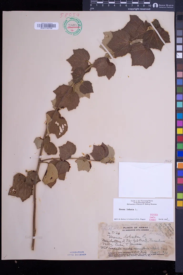 | 16 | Urena lobata | L. | Punaluu Valley. At bottom of Pig-God Trail | Wet roadside under mountain apple trees. | PRESERVED_SPECIMEN | Degener, O. | 7127 | Oahu | BISH | 8/11/1931 |