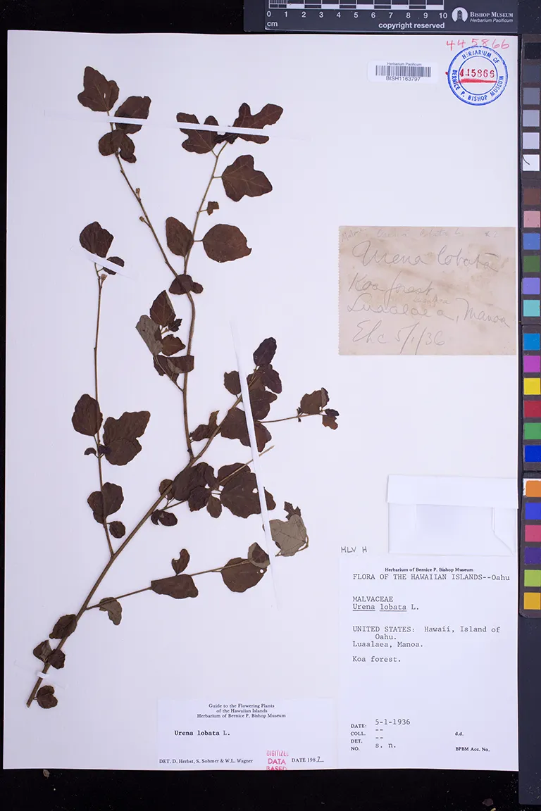 | 11 | Urena lobata | L. | honolulu; manoa, luaalaea; koa forest | PRESERVED_SPECIMEN | anon. | collector number: s.n. | Oahu | BISH | 5/1/1936 | |