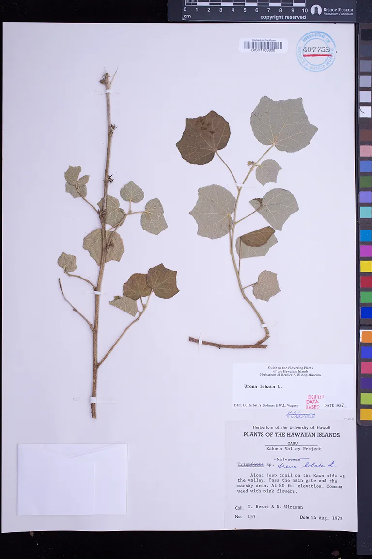 | 20 | Urena lobata | L. | kahana valley project. along jeep trail on the kawa side of the valley. pass the main gate and the marshy area | PRESERVED_SPECIMEN | herat, t. wirawan, n. | collector number: 157 | Oahu | BISH | 8/14/1972 | |