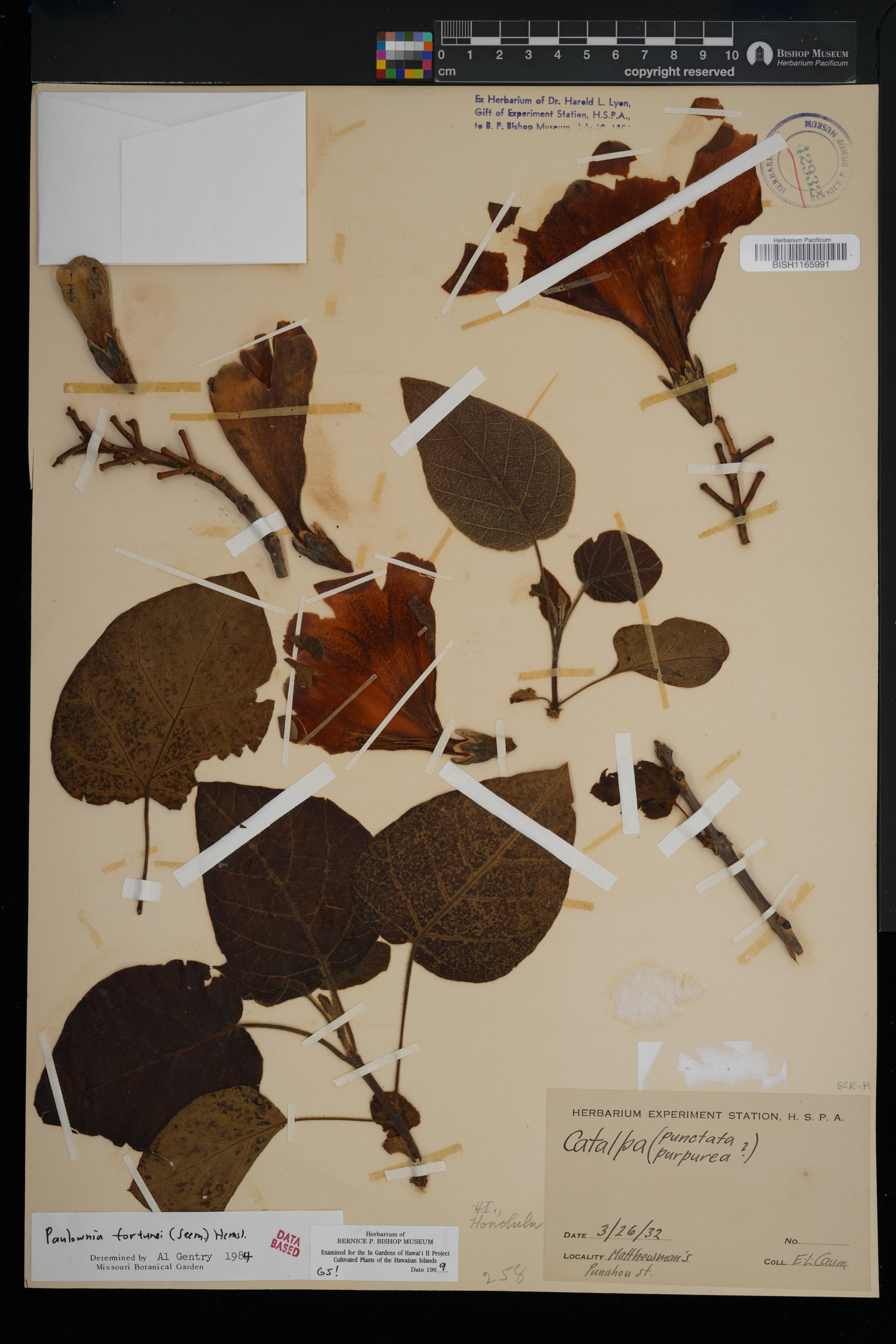 | 6 | Paulownia fortunei | (Seem.) Hemsl. | honolulu, matrthewman's [?, punahou street | PRESERVED_SPECIMEN | caum, e.l. | collector number: s.n. | Oahu | BISH | 3/26/1932 | |