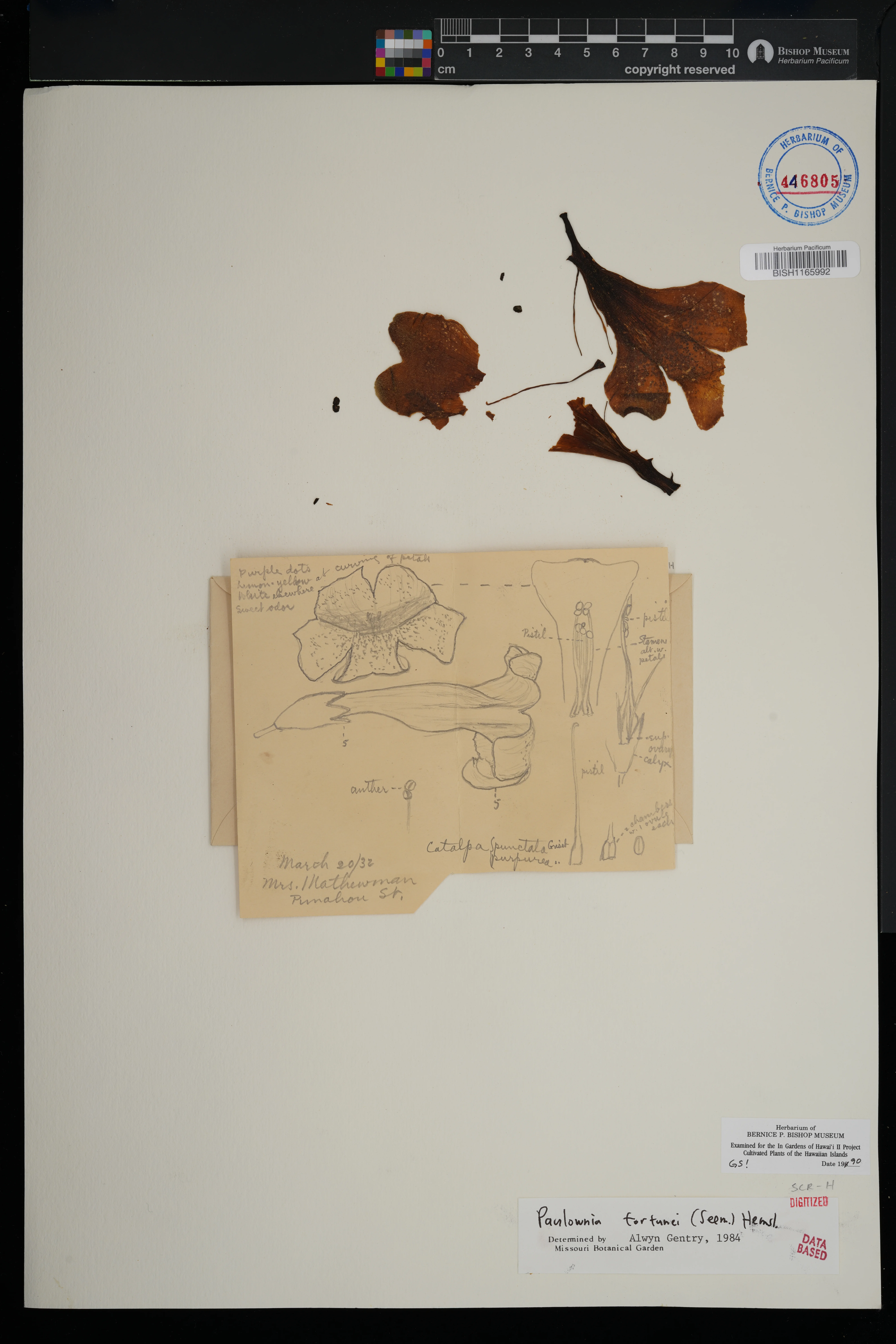| 5 | Paulownia fortunei | (Seem.) Hemsl. | Honolulu, Matrthewman's [?, Punahou Street | PRESERVED_SPECIMEN | Caum, E.L. | s.n. | Oahu | BISH | 3/26/1932 | |