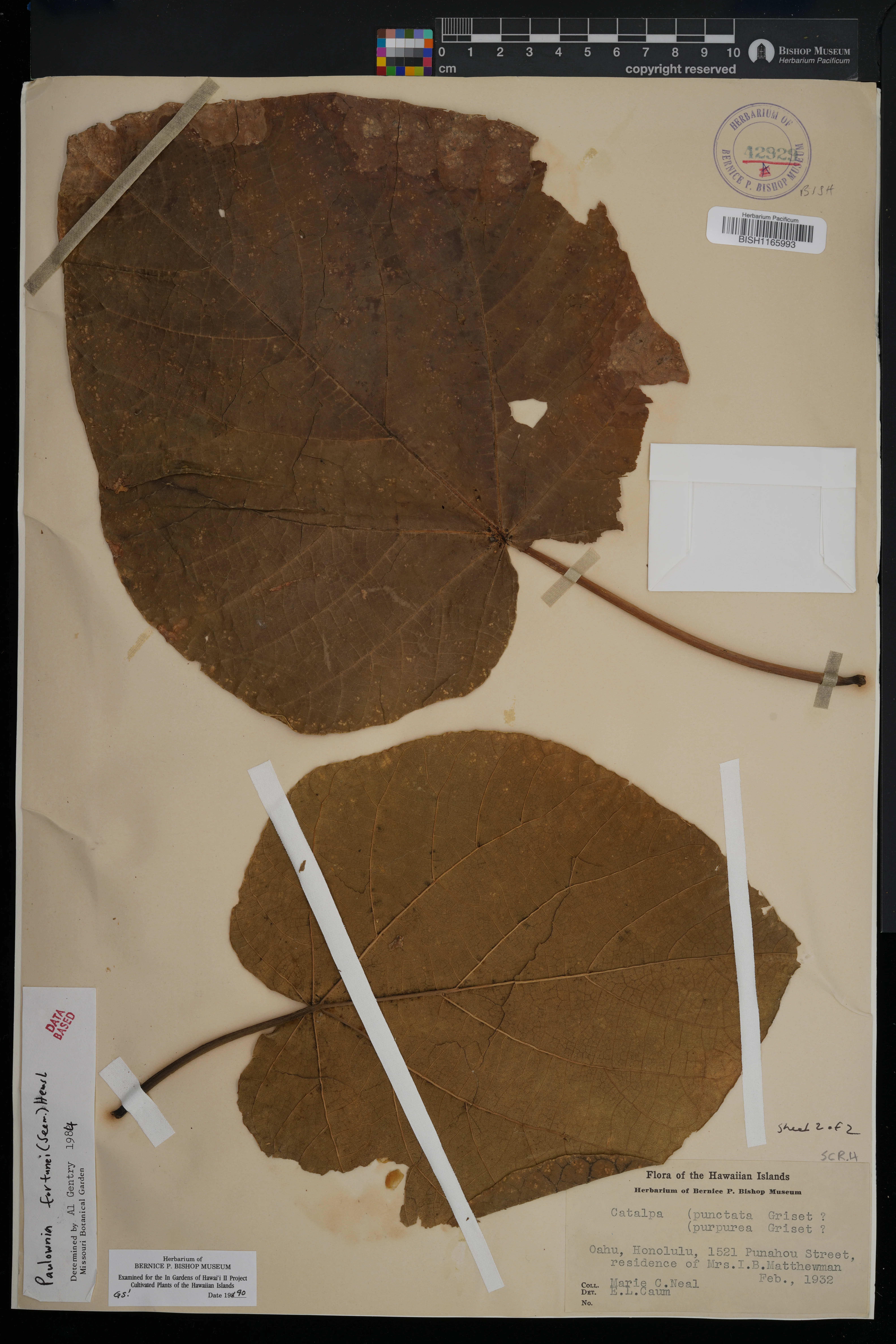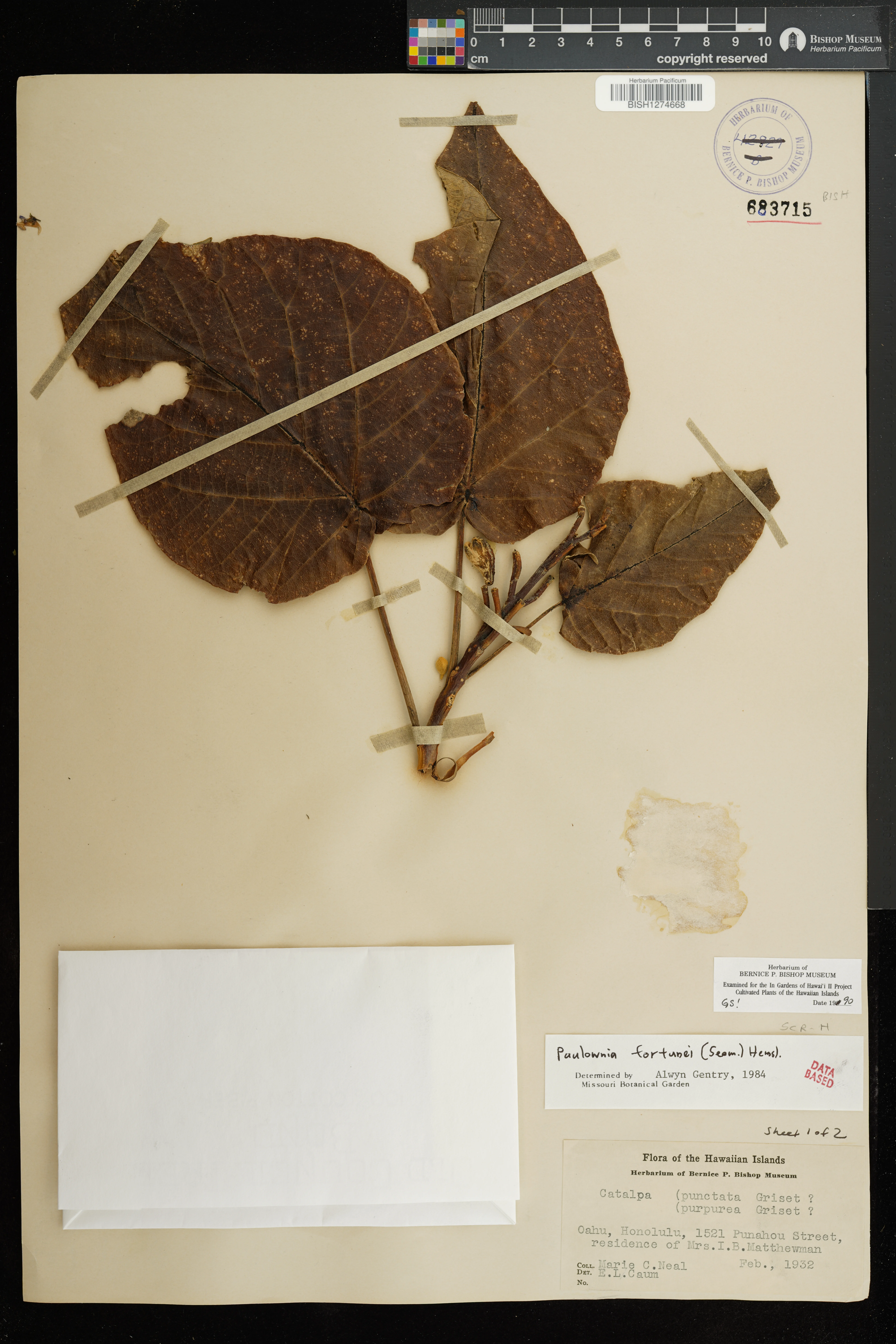 | 3 | Paulownia fortunei | (Seem.) Hemsl. | Honolulu, 1521 Punahou Street, residence of Mrs. I.B.Matthewman | PRESERVED_SPECIMEN | Anon. | s.n. | Oahu | BISH | 3/20/1932 | |
