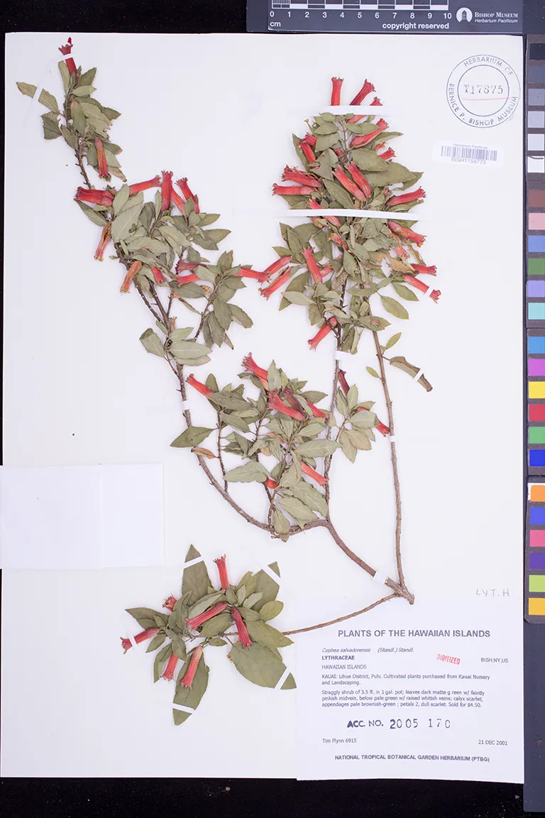 | 12 | Cuphea salvadorensis | (Standl.) Standl. | Puhi. Cultivated plants purchased from Kauai Nursery and Landscaping. | PRESERVED_SPECIMEN | Tim Flynn | 6915 | Kauai | PTBG | 12/21/2001 | |