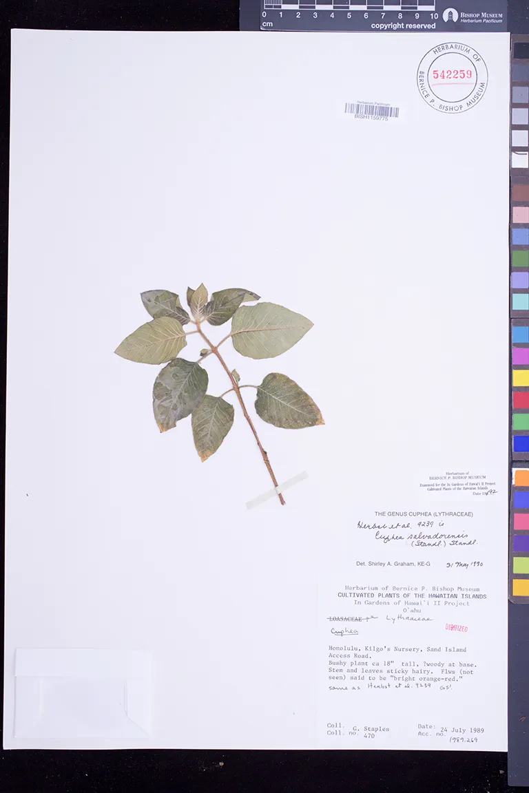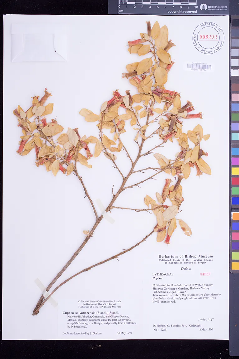 | 11 | Cuphea salvadorensis | (Standl.) Standl. | halawa xeriscape garden | PRESERVED_SPECIMEN | herbst, d.r. staples, g.; a.kadowaki | collector number: 9239 | Hawaii | BISH | 3/3/1990 | |