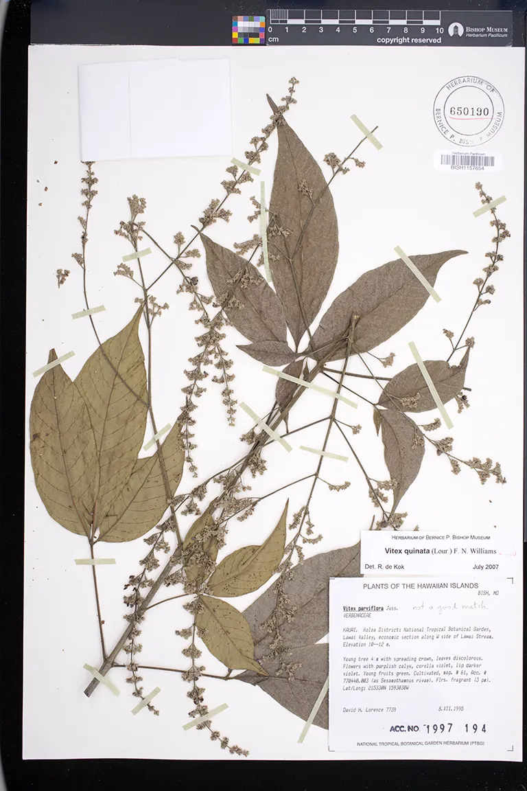 | 4 | Vitex quinata | (Lour.) F.N.Williams | Koloa; National Tropical Botanical Garden, Lawai Valley, economic section along W side of Lawai Stream. Map #61 | PRESERVED_SPECIMEN | Lorence, D.H. | Collector Number: 7739 | Kauai | BISH | 12/8/1995 | |